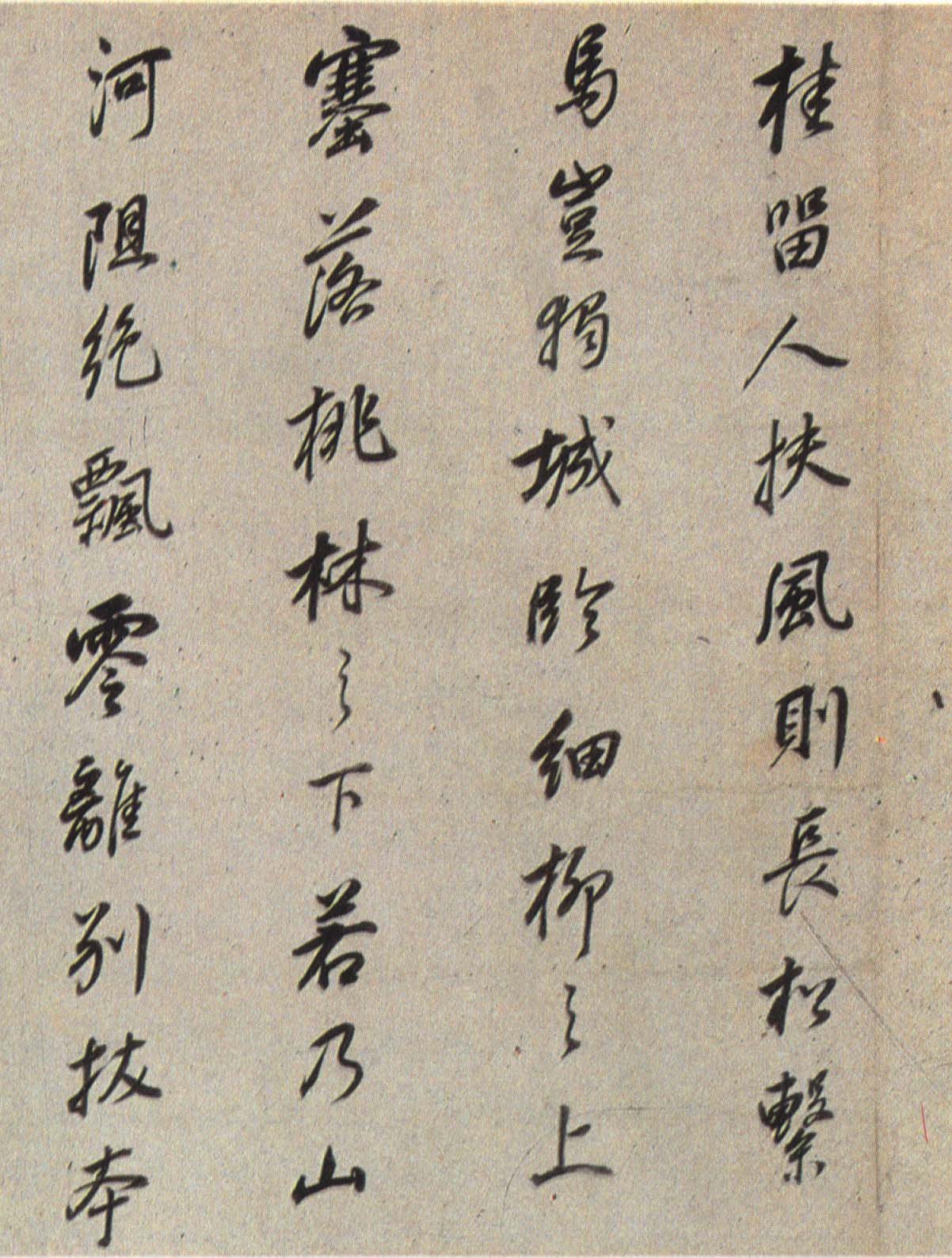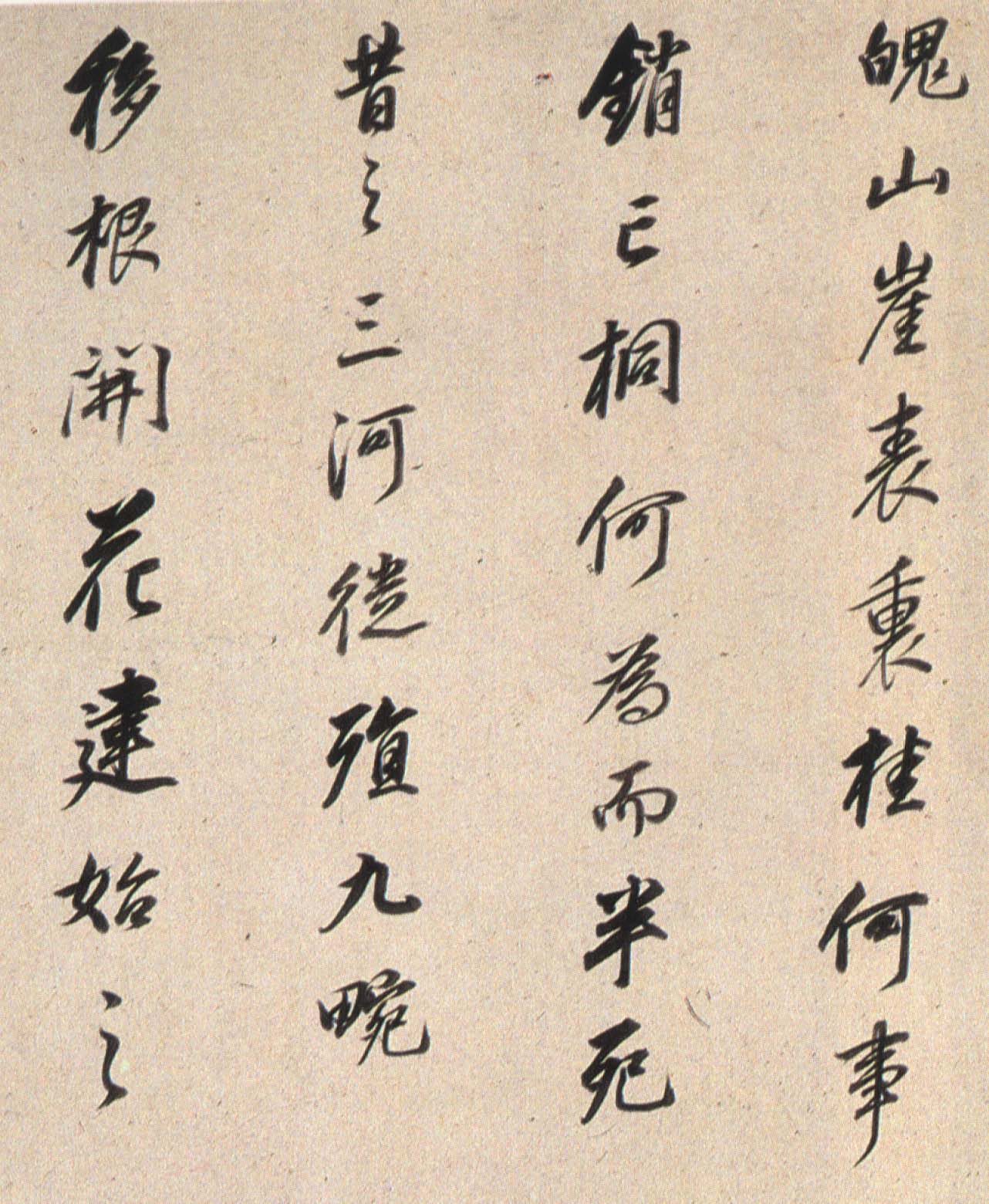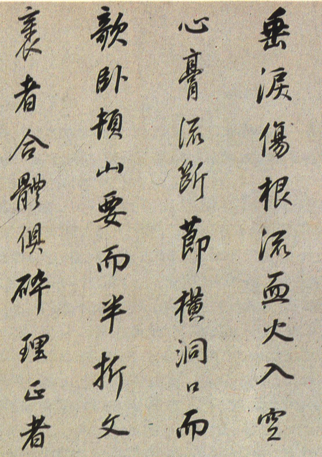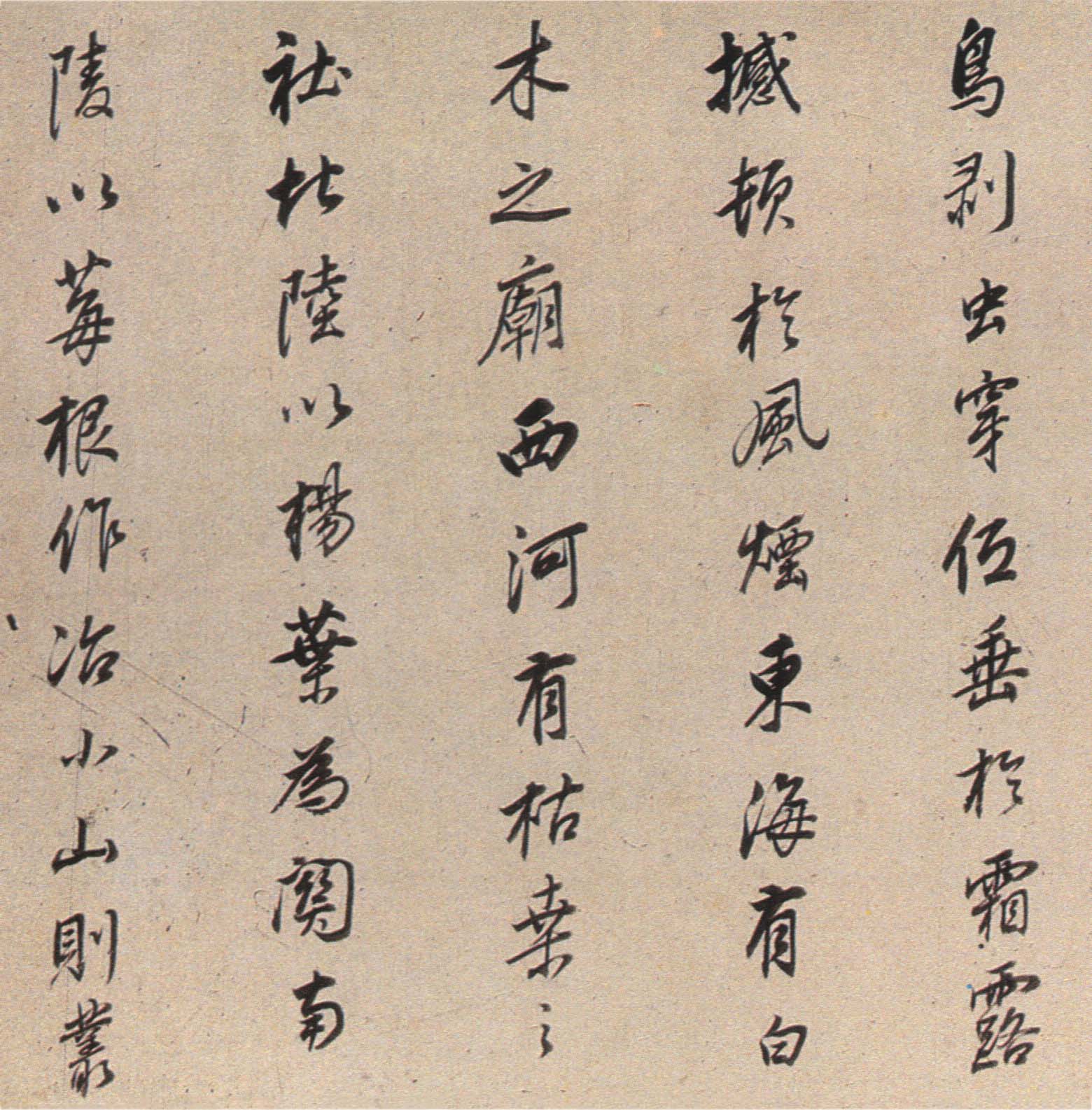 《枯树赋》是南北朝时期文学家庾信羁留北方时所写,以枯树自喻,抒发亡国之痛、故乡之思、羁旅之恨和身世之感。唐褚遂良于贞观四年(六三〇)为燕国公于志宁书此册,墨迹久佚,仅有拓本传世,董其昌《戏鸿堂帖》有收录。《董其昌临枯树赋》,纸本行书,高二十七厘米,长三百六十五厘米,为董氏八十岁时所书,现藏朵云轩。此帖以李北海法写褚,老辣的行笔当中不乏恬静淡然之气,是董其昌行书代表作。