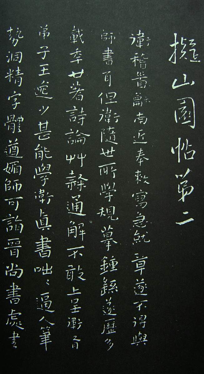 《拟山园帖》,共十卷,清代个人丛帖。清顺治八年至十六年(公元1651-1659年)王铎之子无咎撰集,古燕吕昌摹,张翱镌。帖名行书。此帖全刻王铎一家之书,共103种,其中大多为临古之书。王无咎传留大量的王铎书迹,因而所选皆精湛。刻者亦一时名手,而其它王书刻帖均不如此本为佳,帖后有张缙彦、龚鼎孽及无咎题跋。张缙彦跋曰:“文安公书法妙天下,?毛泰史括所藏书及墨苑家所流传汇集此本,有缺略模糊必求别本正字补之,备极龙跃虎卧猊攫象搏之致,文安四十年精力尽在此矣。近代玄宰、子愿两先生戏鸿、来禽二帖坛?海内,昔卫夫人见右军书叹:"此子必掩我名",此本出,惜两公不及见也。”故此帖无论是所选之帖还是摹刻方面,都极为精妙,远胜琅华、银湾诗酒论二十等帖。