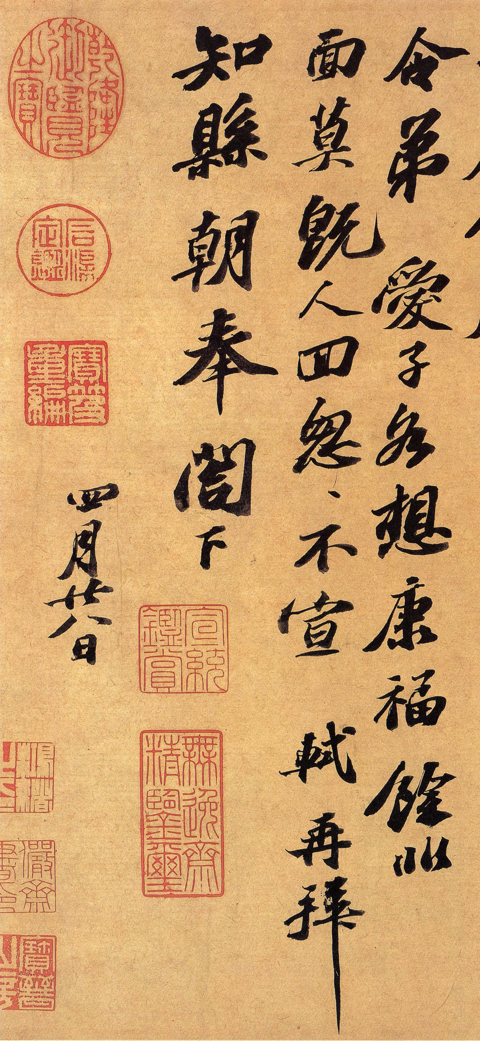 释文:轼启。江上邂逅,俯仰八年,怀仰世契,感怅不已。辱书,且审起居佳胜。令弟爱子,各想康福。余非面莫既,人回匆匆不宣。轼再拜知县朝奉阁下。四月廿八日。