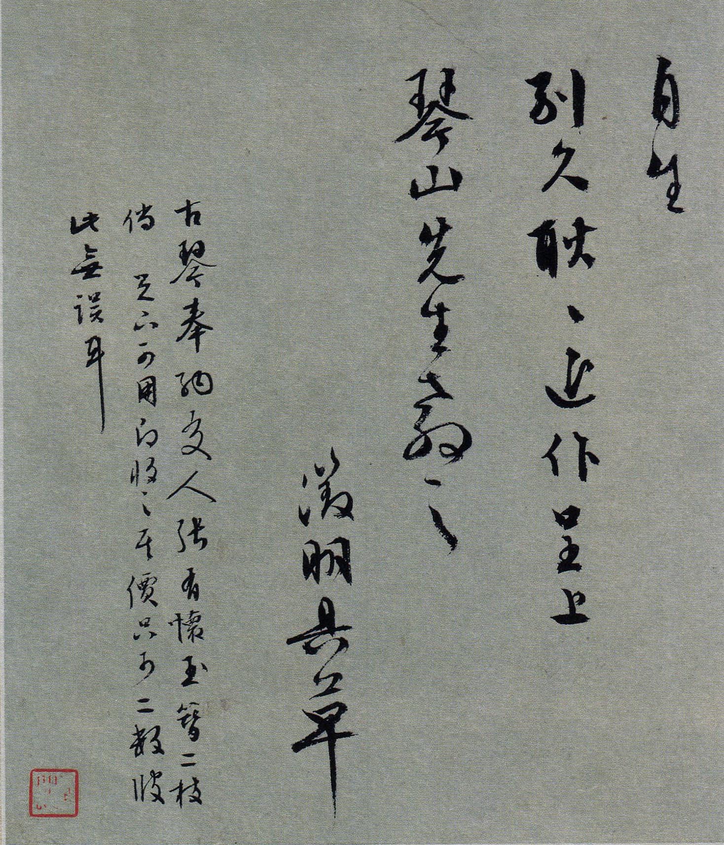 释文:掃地焚香習燕清,蕭然一室謝將迎。坐移白日花間影,睡起春禽竹外聲。心遠不妨人境寂,道深殊覺世緣輕。卻憐不及濂溪子,能任窗前草自生。別久耿耿,近作呈上琴山先生教之。徵明具草。古琴奉納。交人張有懷玉簪二枝,倘足下可用,即收之,其價只可二數,彼此無誤耳。