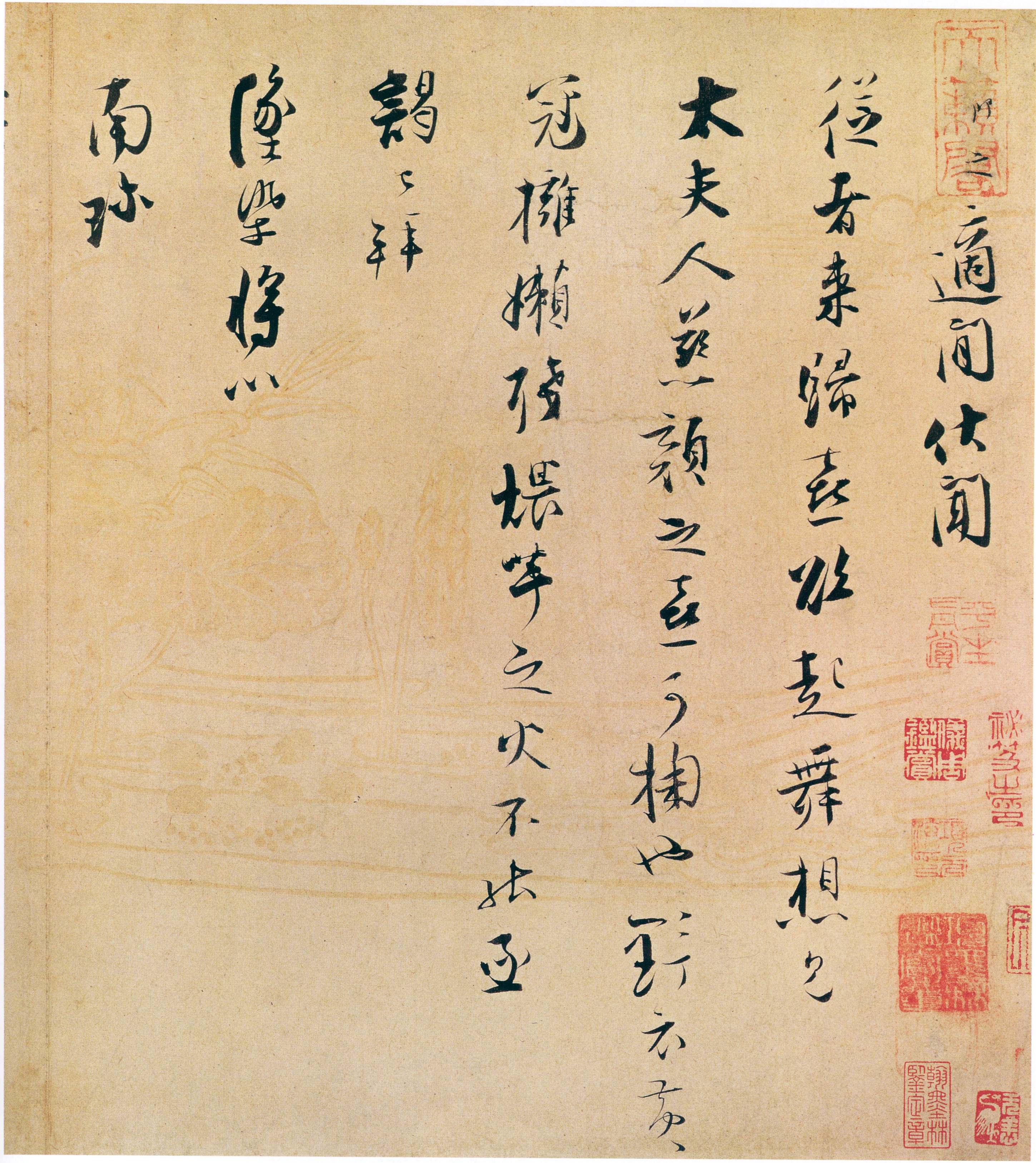 这件“致殿元学士”尺牍,又名“从者来归”帖,是以行草书写在牙色印花纸本上。由信中“野衣黄冠,拥嬾残煨芋之火”等语句看来,大约是张即之晚年(淳祐五年,1245年左右,张即之时年六十岁)退休闲居于家中时所作。这幅尺牍结体疏秀,用笔清俊飘逸,丝毫看不出衰颓的老态。