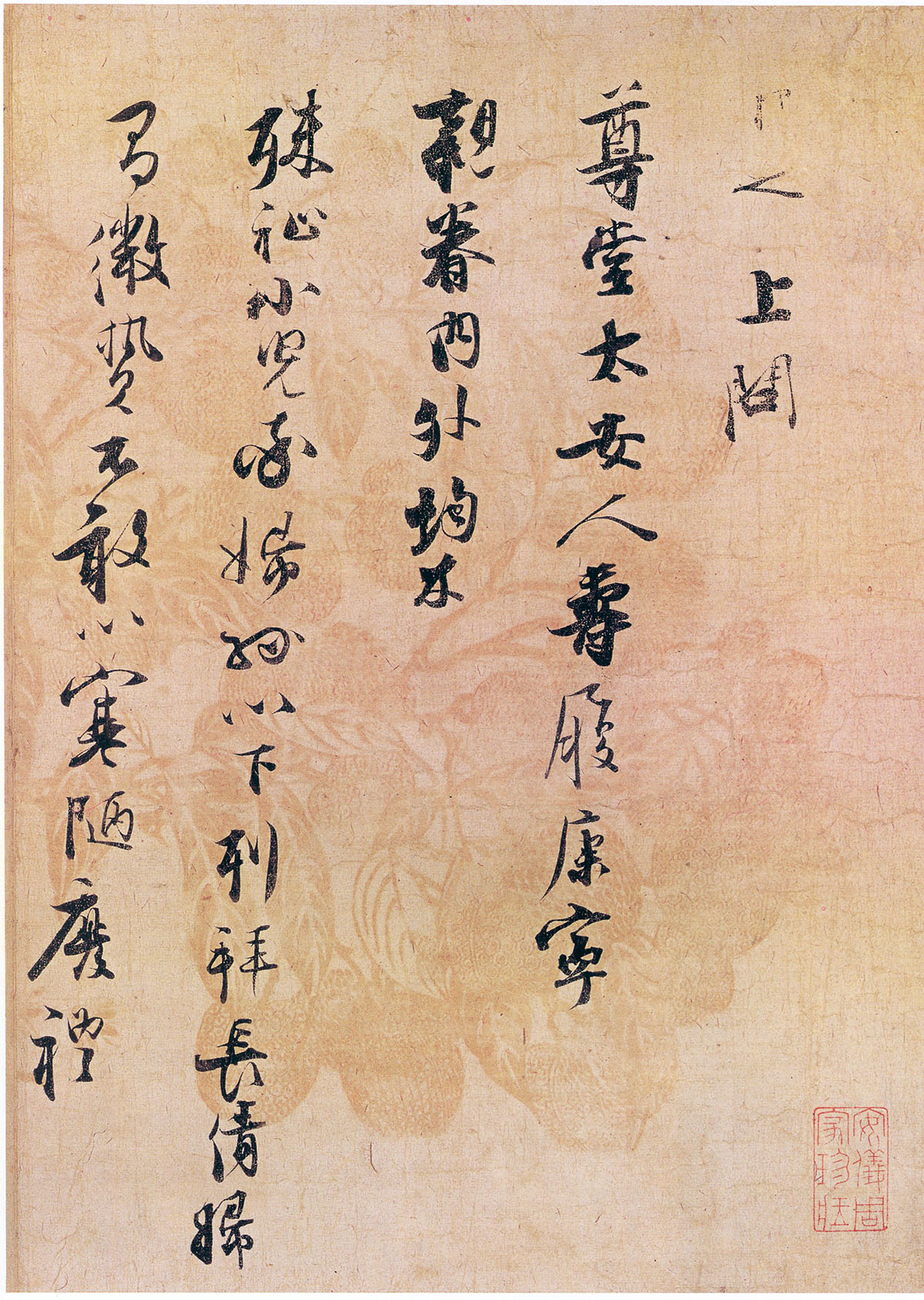 张即之《致尊堂太安人尺牍》册 纸本(牙色印花粉笺) 行书 29.5×47.2cm 台北故宫博物院藏