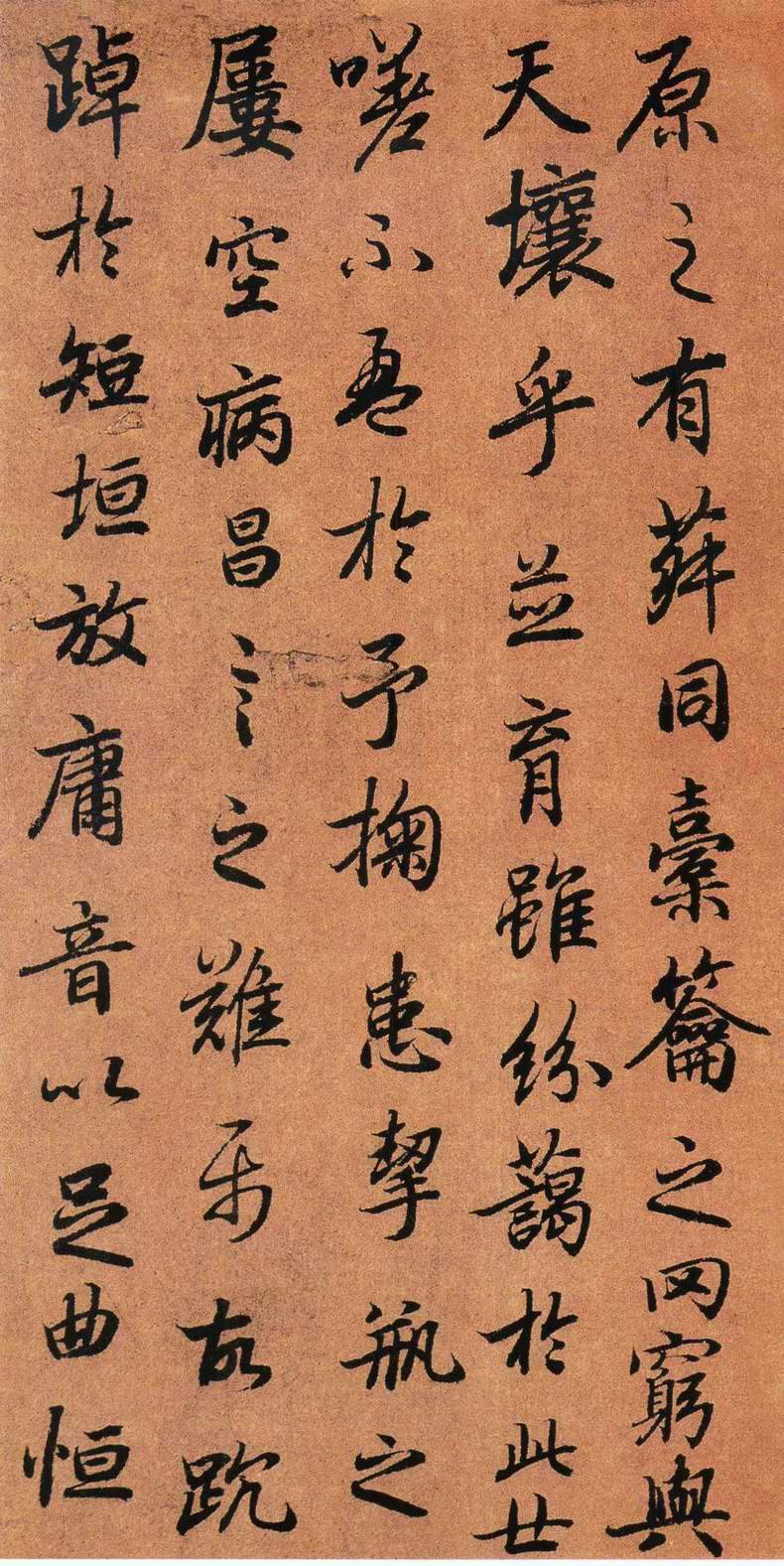 欣赏《文赋》墨迹,用笔清隽飘逸,流转圆润,确实具有《兰亭》那种平和简静的意境。此帖点拂波磔之间,使转运行之际,结体照应之处,皆合《兰亭》妙法。从中可窥陆柬之于《兰亭》所下功夫极深。应当指出王羲之现存法书今已无一真迹,多为唐人摹本。作为摹本形似之差距可能不大,但就作品的贯气,神彩来说都及不上《文赋》神似《兰亭》。因此后世学王书者,对此帖格外珍爱。元赵孟頫就曾临学此帖,从中领悟晋人笔法和结体,其受益是很明显的。