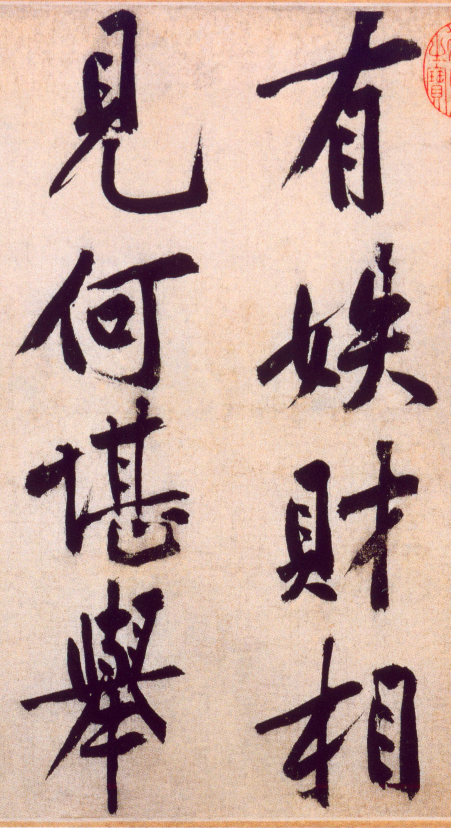 此帖原为《宋元宝翰》册之一,后改装成卷。此诗在《山谷外集》中没有记载,四十九侄亦无考。该帖字大如拳,结体多取柳公权法,字大方可尽其笔势。撇捺特长,笔画多取横势,字势舒展俊朗,跌宕起伏,变化出新,极具挺拔之态。