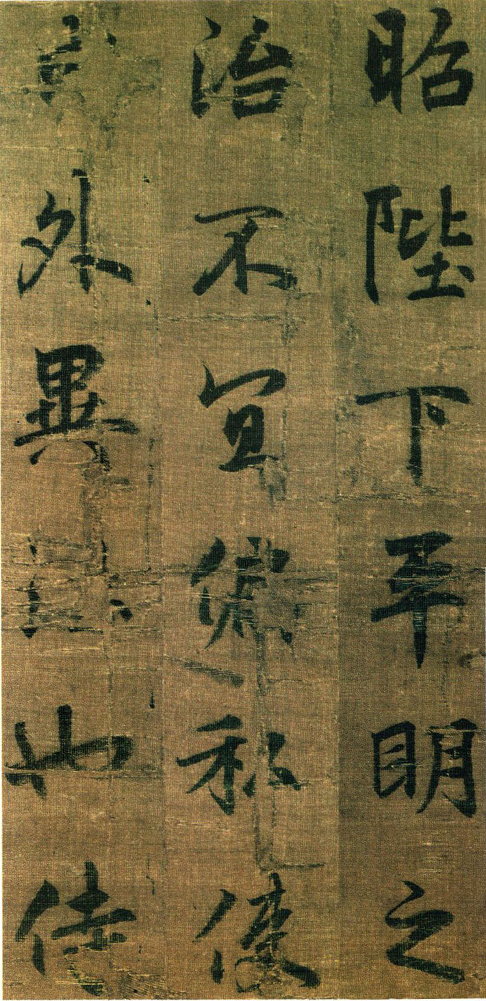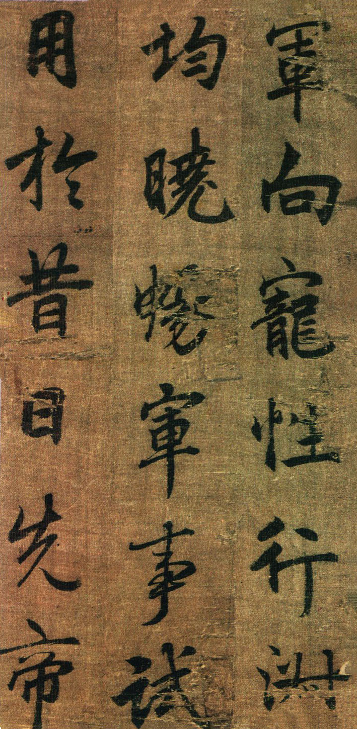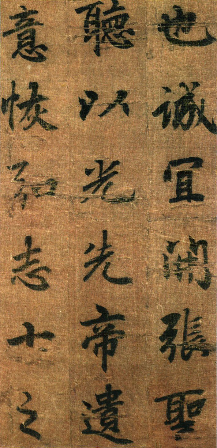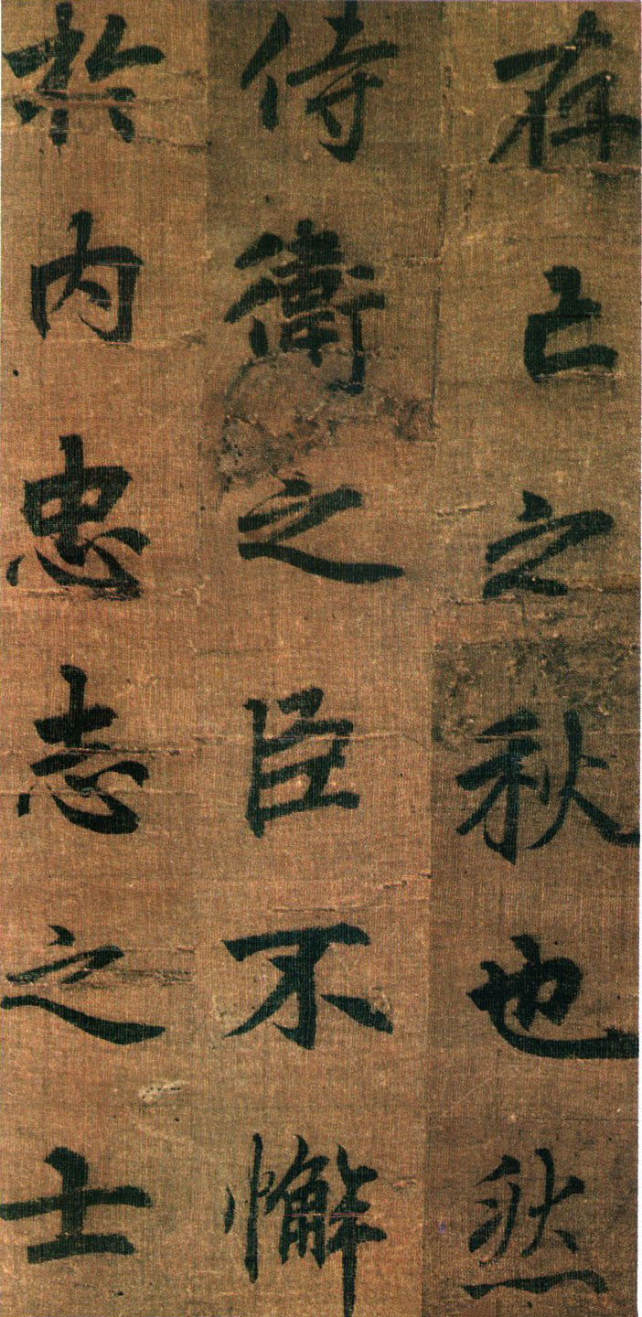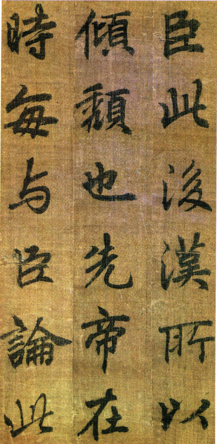 《出师表》墨迹,行书,无款绢本,割裂成册。原本今藏台湾故宫博物院,前有嘉庆御览之宝,宣统御览之宝,石渠宝笈等印,后半及署款皆残缺,书者名不可考,书势似李邕,清《滋蕙堂帖》曾刻,直署为李北海书,近人王壮为编入《中国书画》定为真迹。此册不见宋明著录,落笔结字庄峻有法,较《四言古诗卷》为优,以李书《法华寺》,《李思训》等碑较之,神韵若合。然有一二未惬意之笔,若非邕书,当为学邕书之善者。