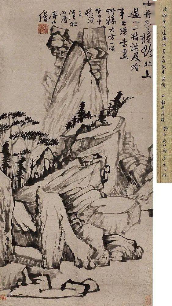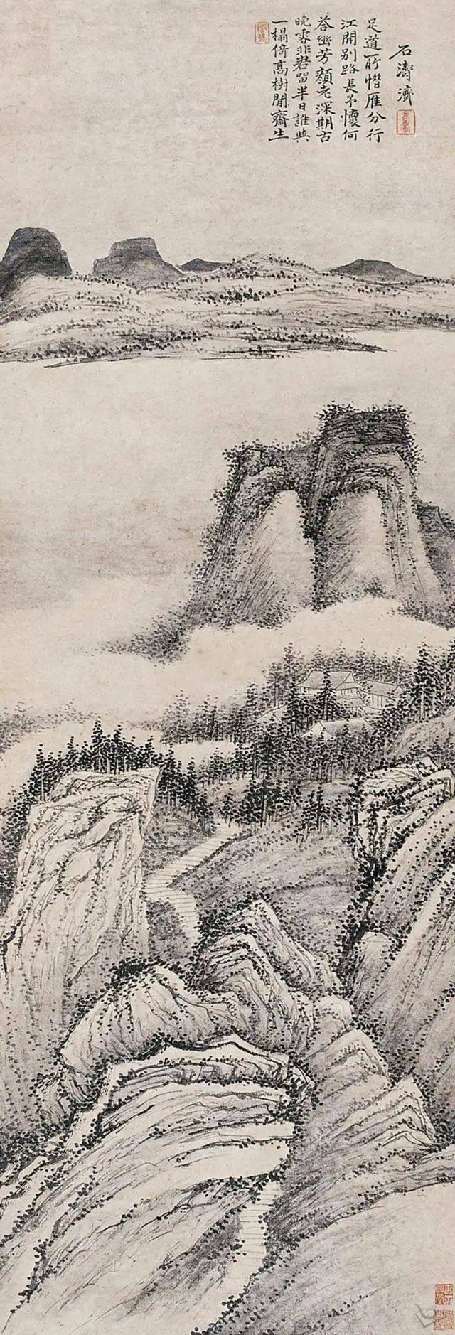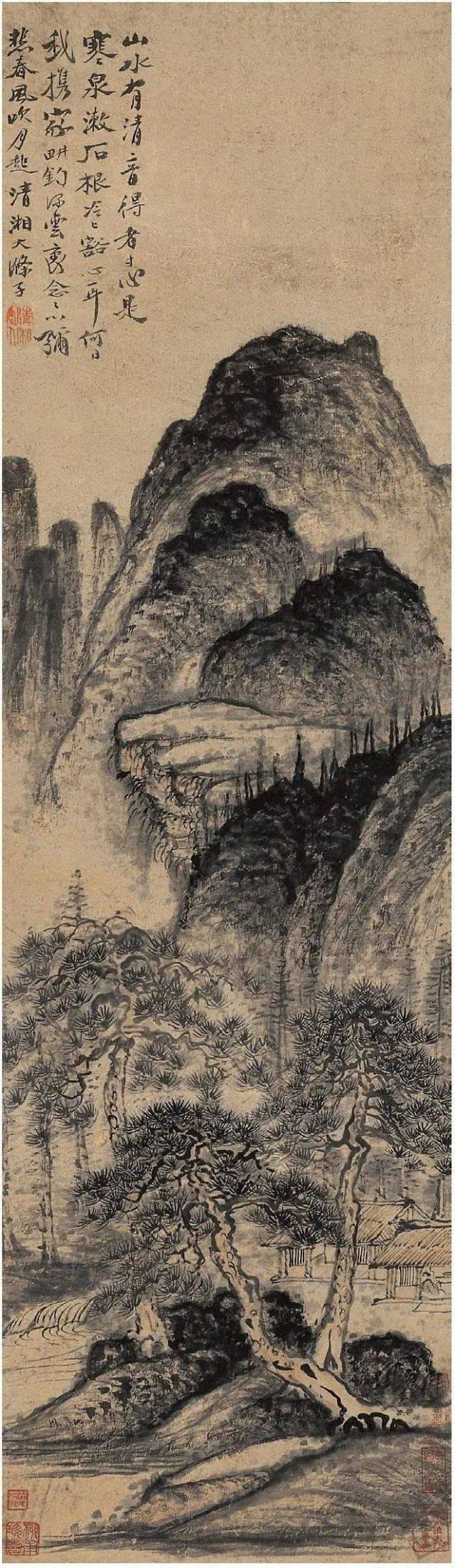 石涛幼年遭变后出家为僧,驻锡于安徽宣城敬亭山广教寺,后半世云游,以卖画为业。早年山水师法宋元诸家,画风疏秀明洁,晚年用笔纵肆,墨法淋漓,独创“万点恶墨”技法和截断式构图,尤精册页小品;花卉潇洒隽朗,天真烂漫,清气袭人;人物生拙古朴,别具一格。工书法,小楷深得钟繇精髓,所书《道德经》全卷五千余字现存台北故宫;能诗文。存世作品有《石涛罗汉百开册页》《搜尽奇峰打草稿图》《山水清音图》《竹石图》《墨梅册》等。著有《苦瓜和尚画语录》,提出“一画论”“搜尽奇峰打草稿”“笔墨当随时代”等理论。
