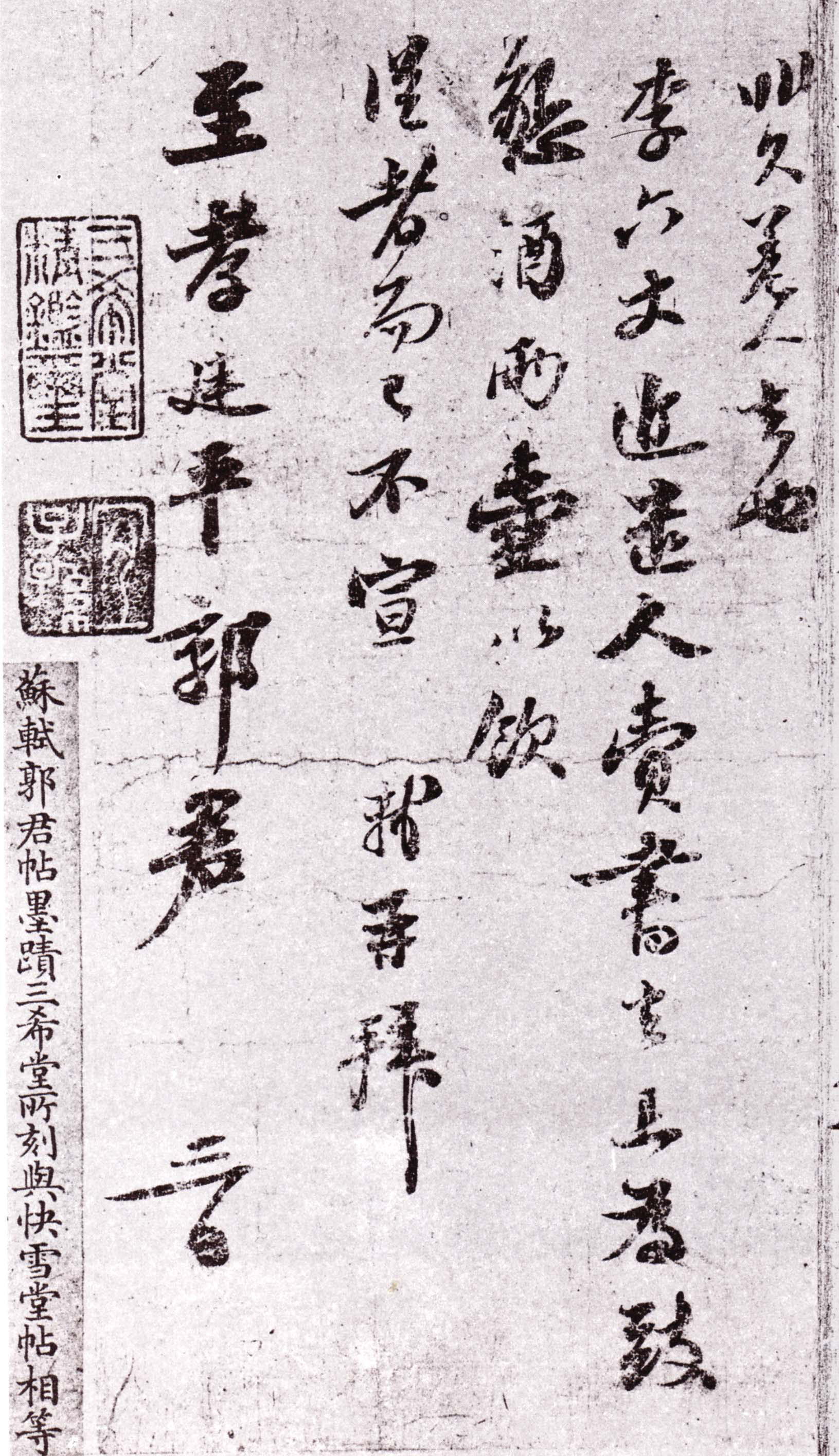 释文:轼启 辱教 具审孝履支持 承来日遂行 适请数客 未得走别 来晨如不甚早发 当诣见次 梅君书写未及 非久差人去也 李六丈近遣人赉书去 且为致恳 酒两壶 以饮从者而已 不宣 轼再拜 至孝廷平郭君 三日
