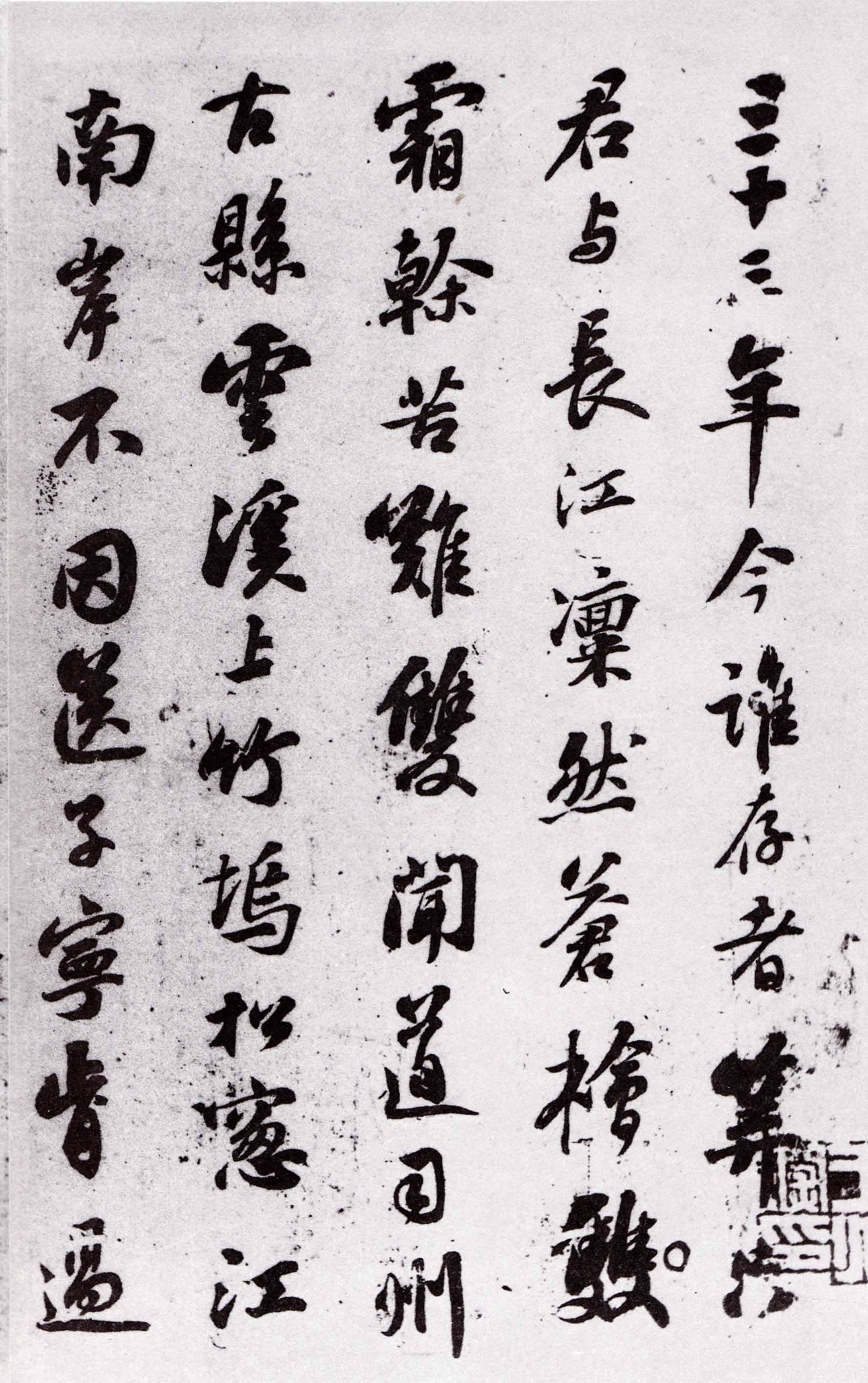 释文:三十三年,今谁存者?算只君与长江。凛然苍桧,霜干苦难双。闻道司州古县,云溪上、竹坞松窗。江南岸,不因送子,宁肯过吾邦?