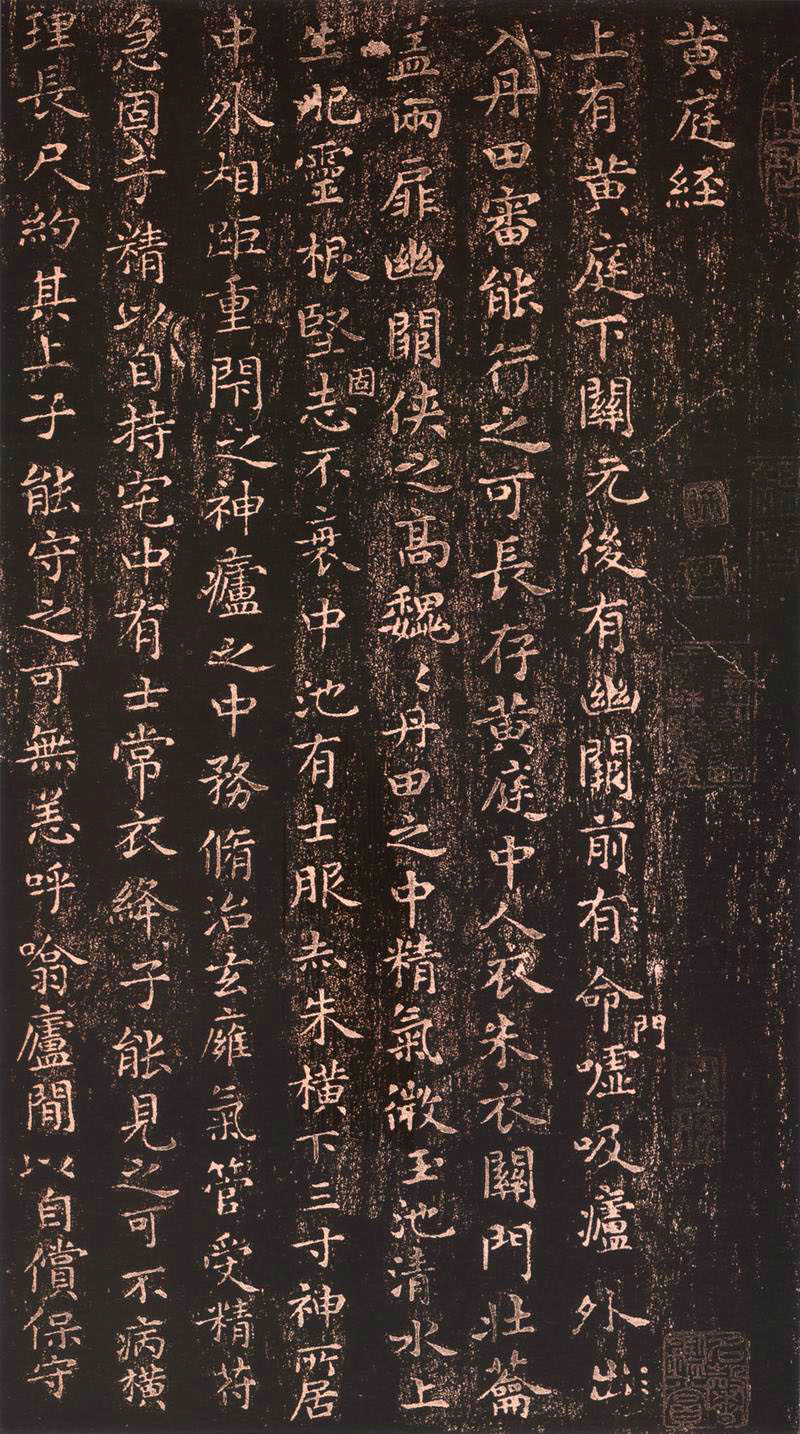 《黄庭经》,王羲之书,小楷,一百行。原本为黄素绢本,在宋代曾摹刻上石,有拓本流传。此帖其法极严,其气亦逸,有秀美开朗之意态。关于黄庭经,有一段传说:山阴有一道士,欲得王羲之书法,因知其爱鹅成癖,所以特地准备了一笼又肥又大的白鹅,作为写经的报酬。王羲之见鹅欣然为道士写了半天的经文,高兴地“笼鹅而归”。原文载于南朝《论书表》,文中叙说王羲之所书为《道》、《德》之经,后因传之再三,就变成了《黄庭经》了。
