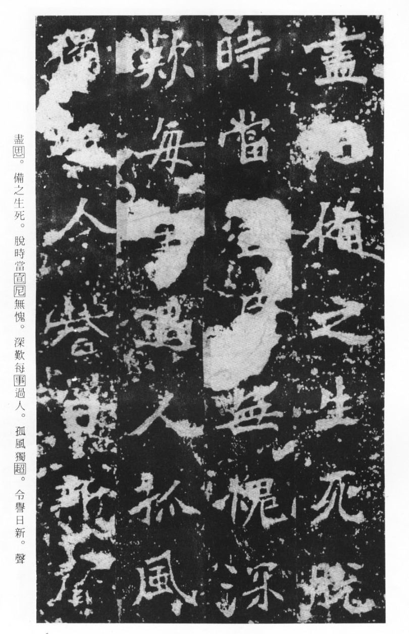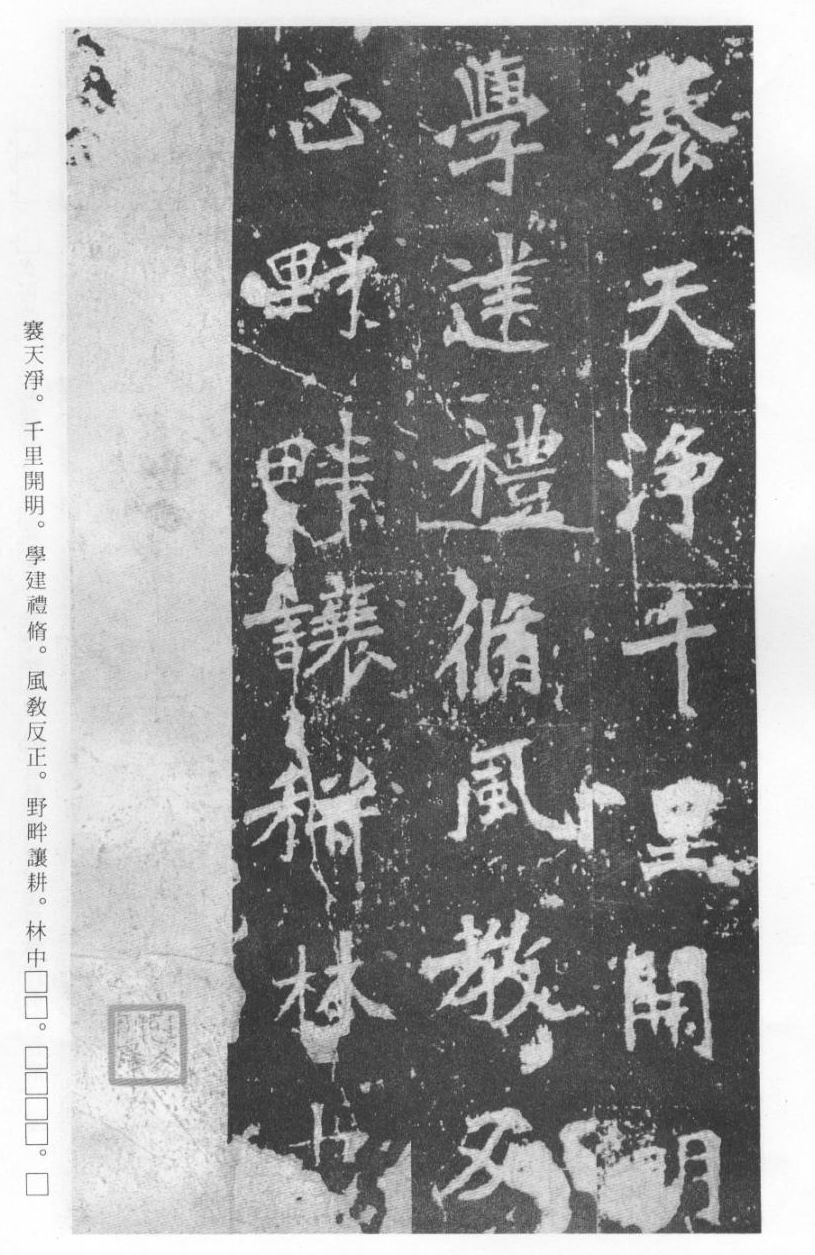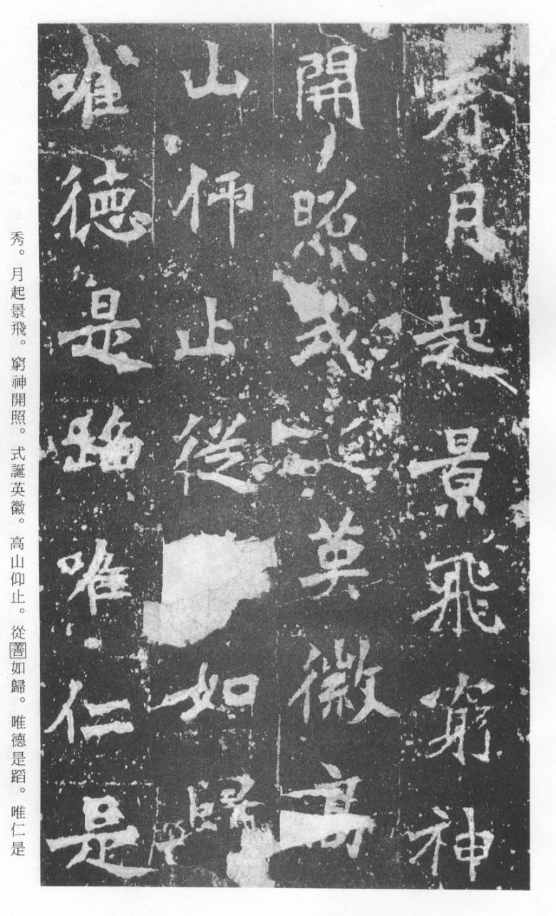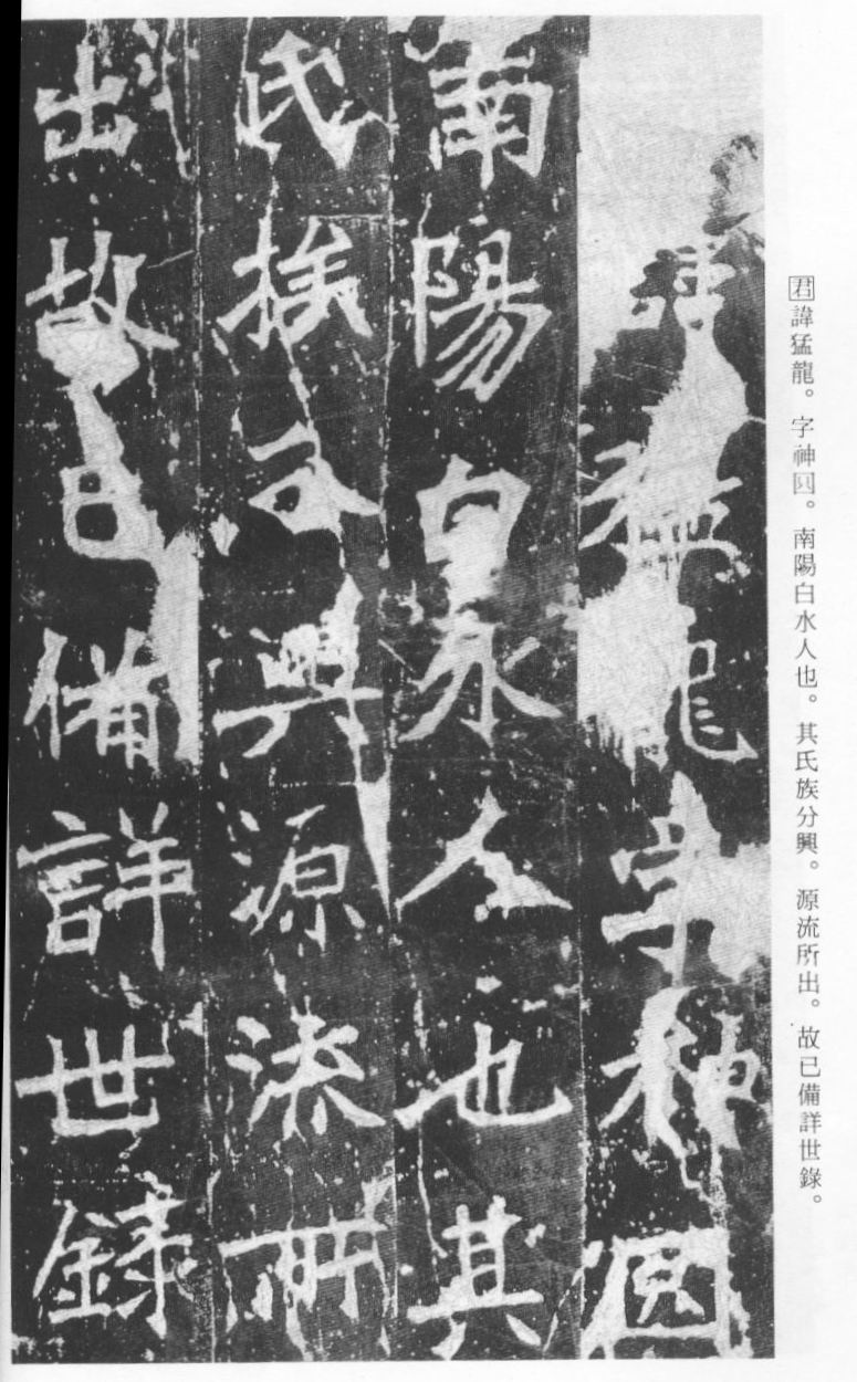 《张猛龙清颂碑》立于北魏孝明帝正光三年(五二二),全称《魏鲁郡太守张府君清颂之碑》,现在山东曲阜孔庙中,有额有阴,碑文记颂魏鲁郡太守张猛龙兴办学校功绩,碑阴为题名,古人评价其书“正法虬已开欧虞之门户”,向被世人誉为“魏碑第一”。楷书二十六行,行四十六字,是魏碑后期佳作之一。碑文书法用笔方圆并用,结字长方,笔画虽属横平竖直,但不乏变化,自然合度,妍丽多姿。碑文中的“冬温夏清”四字被认为是鉴别有关张猛龙碑古拓、今拓、原拓、翻拓的重要依据。据说有些古人拓碑,每拓一次之后就要把原碑上的某字去掉一点或留下某种印记,使后人之拓永远不能与前人之拓相雷同相媲美,更不用说伪造作假了,可见古人用心之良苦。