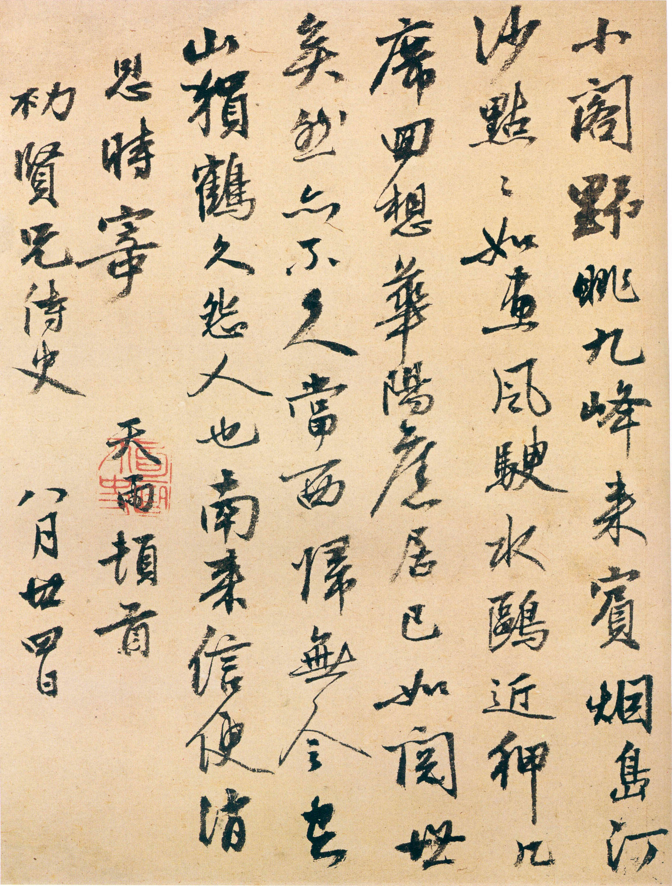释文:天雨頓首。近因澱湖社集。愛其風物。遂結茆於西靜住庵雲鉢道人居之東。則陳仲遠暨楊方塘實主其事。地故有淨室三楹。并少竹樹。因陋就簡。力半功倍。不月而成。小閣野眺。九峯來賓。烟島汀沙。點點如畫。風(應作颿)水鷗。近狎几席。回想華陽舊居。已如閱世矣。然亦不久當西歸。無令空山鶴久怨人也。南來信便。消息時寄。天雨頓首□□賢兄侍史。八月廿四日。