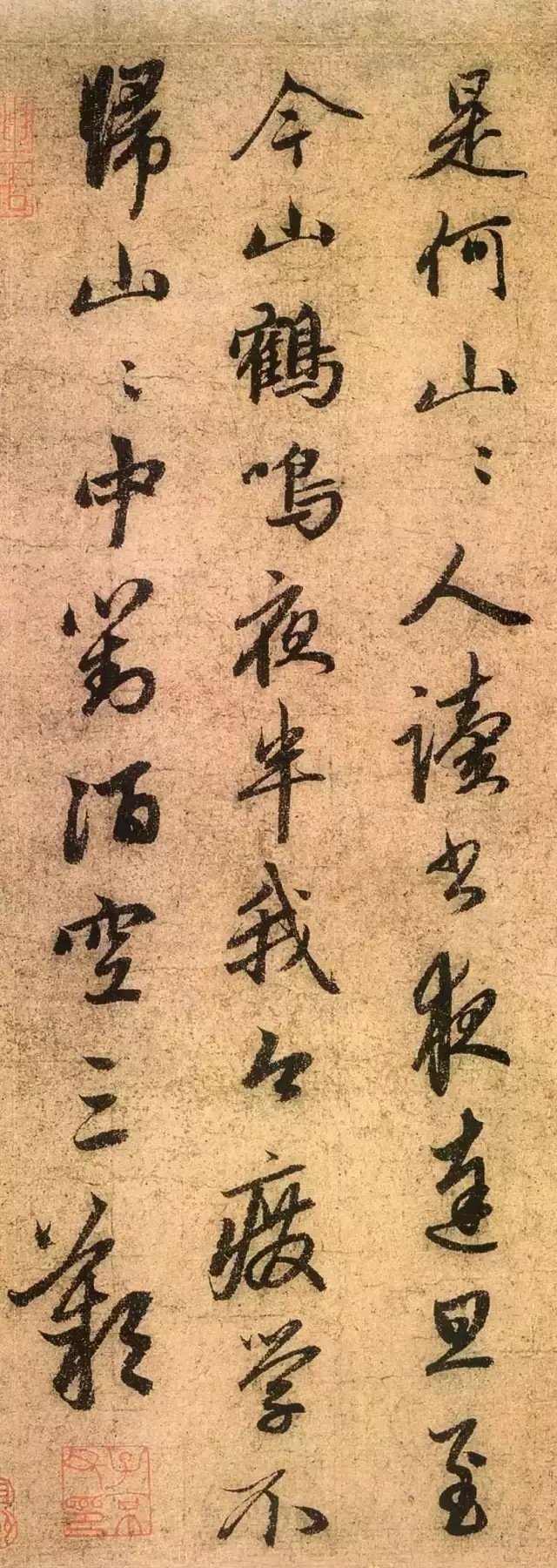 道场山、何山均为赵氏家乡湖州名山,峰峦秀郁,水石森爽,汇集了众多自然与人文景观,自古便为吴兴佳绝。历代文化名人在此留下了很多诗篇,苏轼作《游道场山何山》诗便是最著名者。此帖为赵孟頫为其长兄孟頔之孙所书。这件墨迹清劲秀丽,古雅有致,可谓诗书合璧。