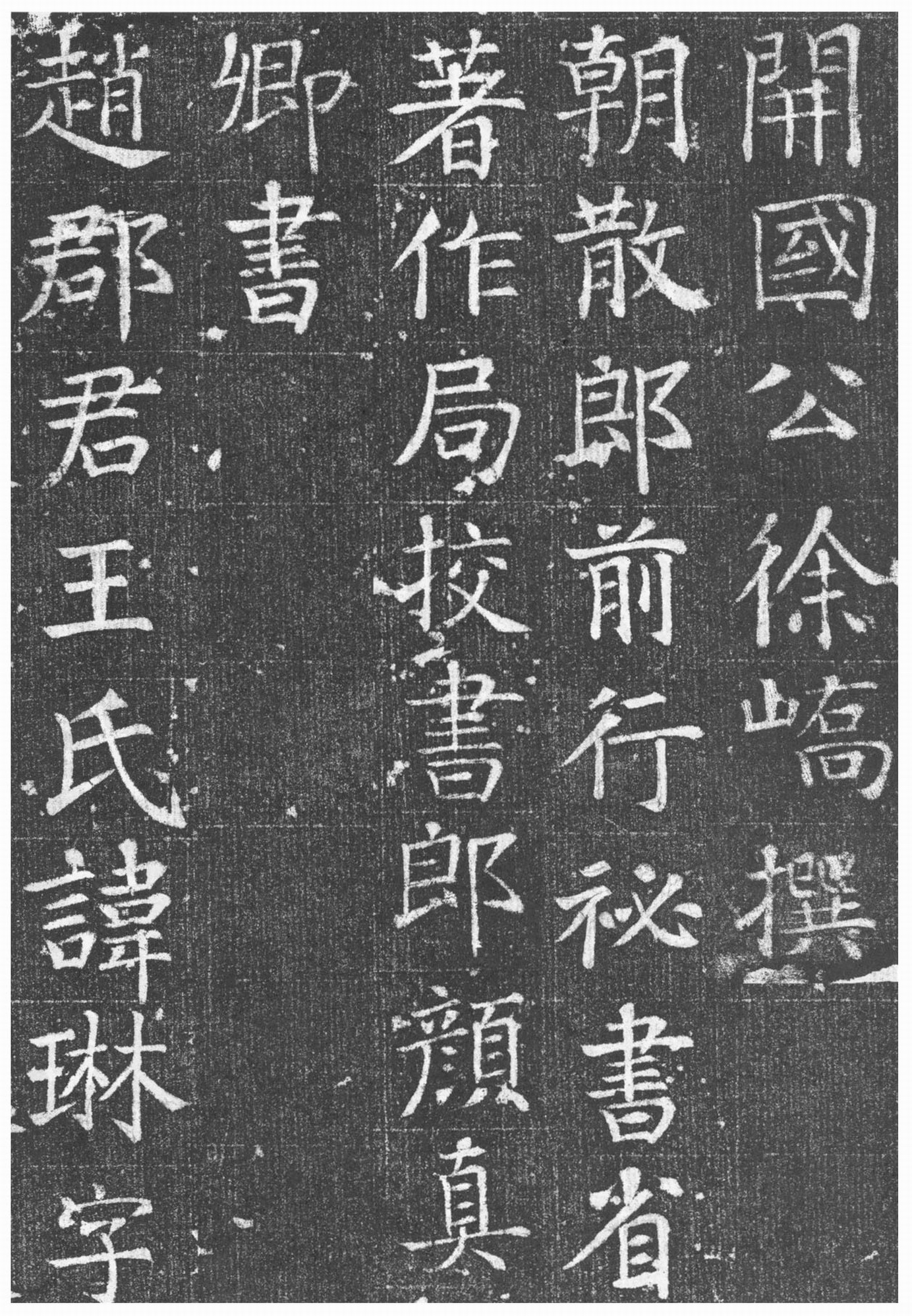 唐颜真卿王琳墓志,全称“唐故赵郡君太原王氏墓志铭并序”,为唐代石灰岩质墓志,高90厘米,宽90.5厘米,三侧刻缠枝花纹,下侧刻云纹及“开元廿九年记”数字。该墓志2003年秋出土于河南省洛阳市龙门镇张沟村,与《徐峤墓志》同时出土,由颜真卿书丹。志文32行,每行32字,有浅界格,撰文者为王琳之夫徐峤。此志书于开元廿九年(741年),颜真卿时年33岁,是目前所见最早的颜真卿书法碑刻作品,较《多宝塔碑》早11年。徐峤官至润州刺史、江南东道采访处置兼福建等州经略使、慈源县开国公,是颜真卿的远房表兄,徐峤让颜真卿书丹可谓慧眼识珠。