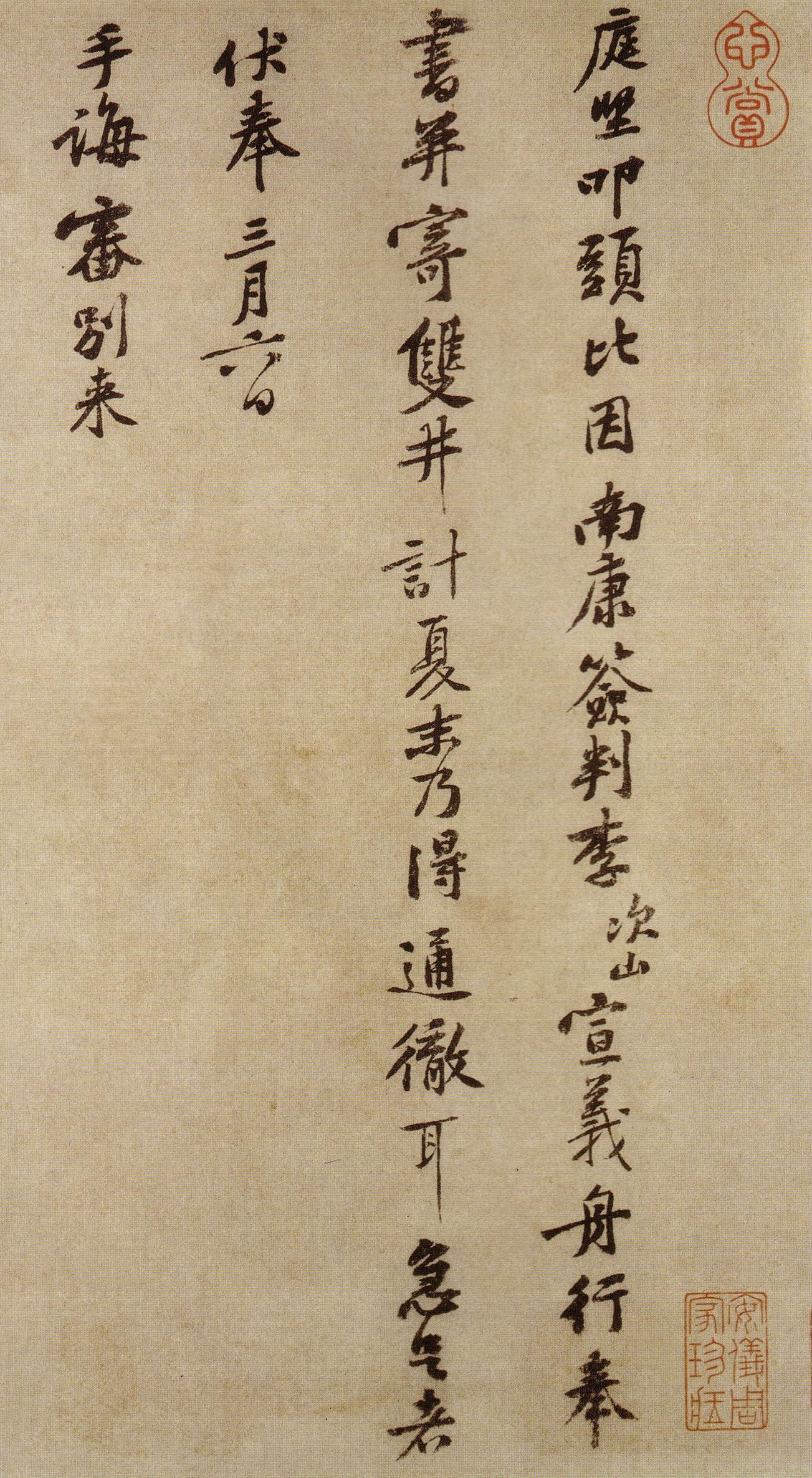 黄庭坚《致无咎通判学士帖》(《南康帖》) 纸本行书 30.8×64.7cm 台北故宫博物院藏释文: