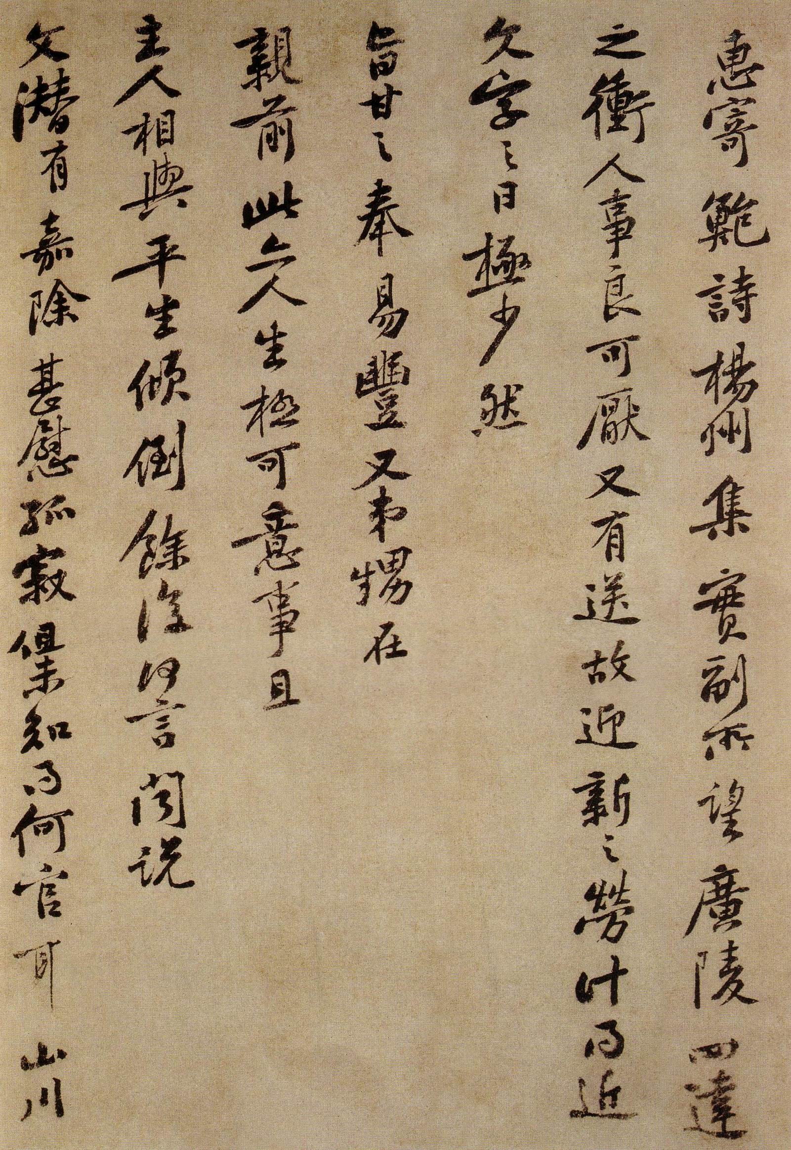 惠寄鲍诗、杨(扬)州集。实副所望。广陵四达之冲。人事良可厌。又有送故迎新之劳。计得近文字之日极少。然旨月‘之奉易丰。又弟甥在亲前。此亦人生极可意事。且主人相与。平生倾倒。徐复何言。闻说文潜有嘉除。甚慰孤寂。但未知得何官耳。山川悠远。临书怀想不可言。千万为亲自重。搏前颇能刚制酒否。每思公在魏时多小疾。亦不能忘念。不次。庭坚叩头。上 无咎通判学士老弟。