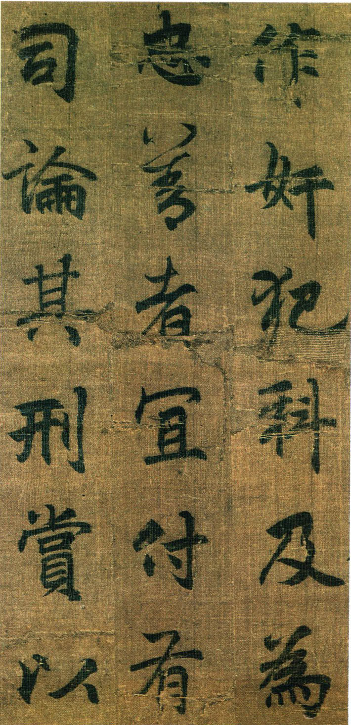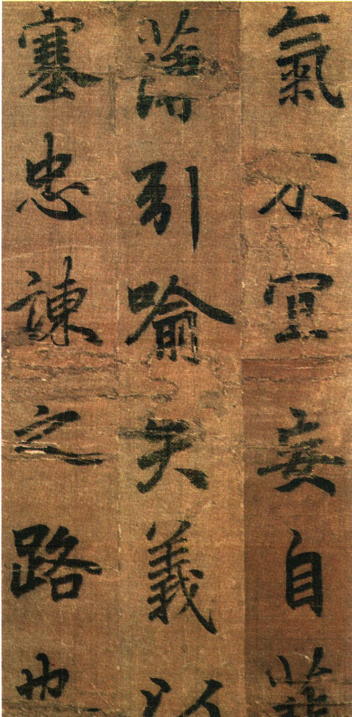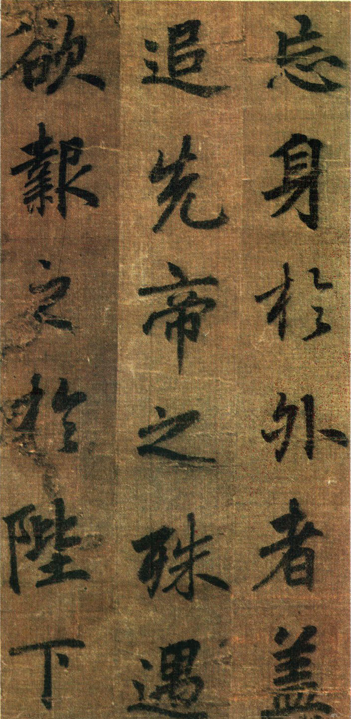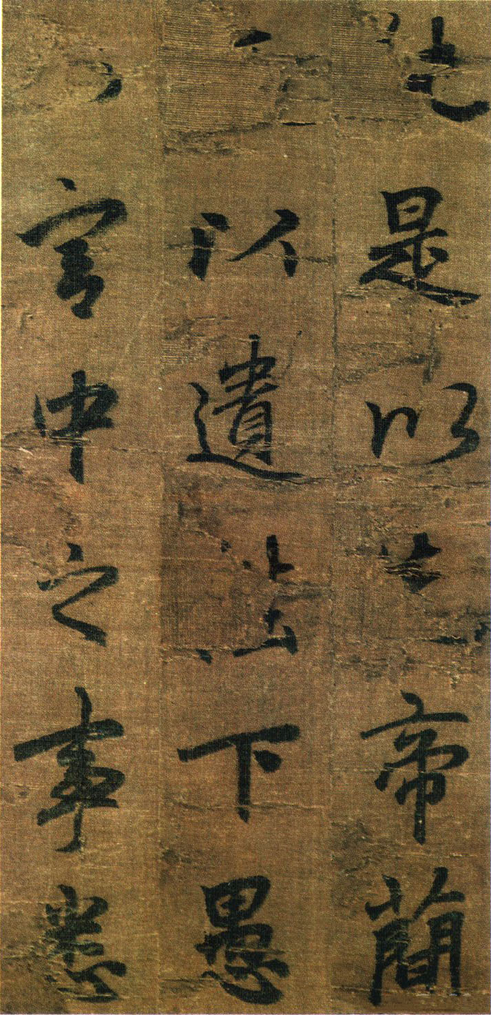 《出师表》墨迹,行书,无款绢本,割裂成册。原本今藏台湾故宫博物院,前有嘉庆御览之宝,宣统御览之宝,石渠宝笈等印,后半及署款皆残缺,书者名不可考,书势似李邕,清《滋蕙堂帖》曾刻,直署为李北海书,近人王壮为编入《中国书画》定为真迹。此册不见宋明著录,落笔结字庄峻有法,较《四言古诗卷》为优,以李书《法华寺》,《李思训》等碑较之,神韵若合。然有一二未惬意之笔,若非邕书,当为学邕书之善者。