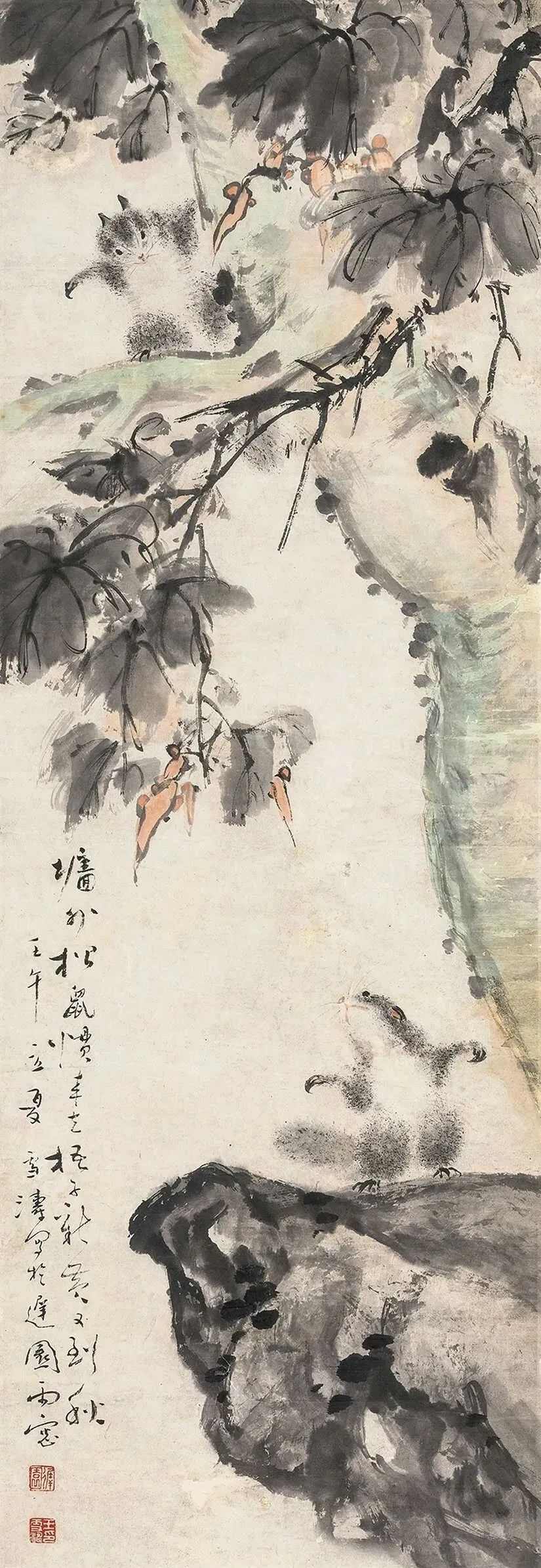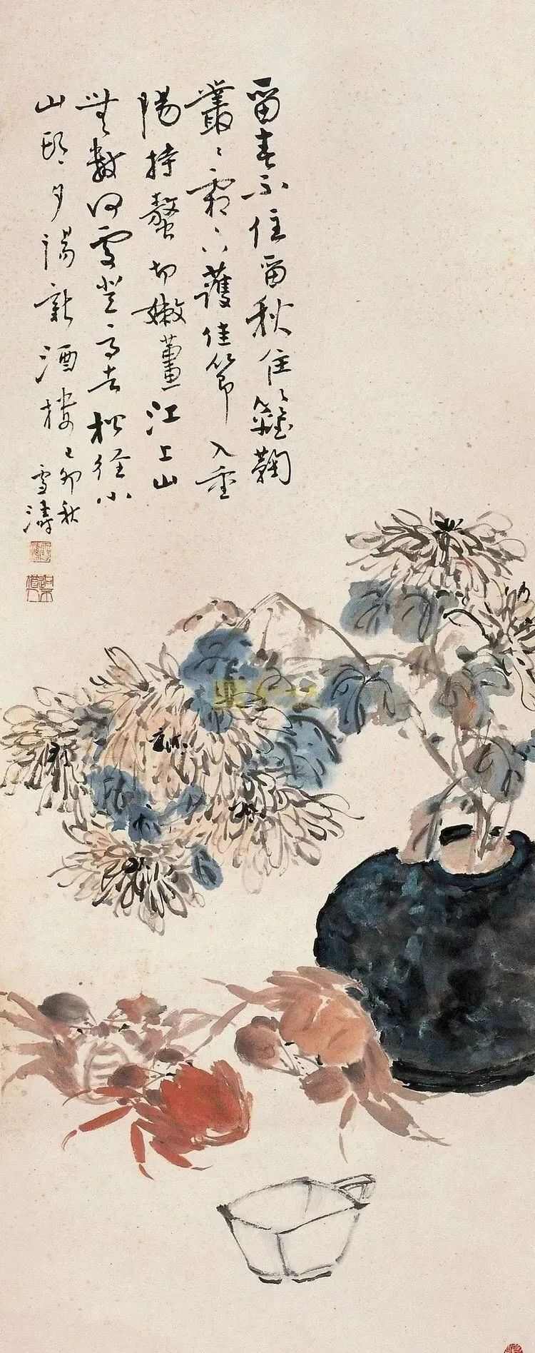 王雪涛于1926年毕业于国立北平艺术专科学校;1929年,任京华美术专科学校教授;1931年,与王梦白合作创作作品《鸲鹆梧桐图》,另创作作品《百鸟图卷》等;1940年,创作作品《夜读图》《秀竹秋虫》等。 1948年,创作作品《十二属相图》《雪梅鸡觅》《桃花山鸡》等;1951年,与齐白石、陈半丁、于非闇等合作创作作品《普天同庆》;1956年4月,增选为中国美术家协会理事;1958年,创作作品《牵牛豆花》等;1961年,创作作品《铁线莲》《丽江山花》;1965年,创作作品《山茶寒鹊》《藤萝群鸡》;1975年,创作作品《花蝶》《豆花》等;1978年,任北京画院院长;1980年,任中国美术家协会北京分会副主席;1981年,作品《禽鸟八条幅》参加首届北京画院与日本南画院联展,另创作作品《临风索侣》《墨笔石榴》《紫滕八哥》等;1982年11月24日,在北京逝世,享年79岁。