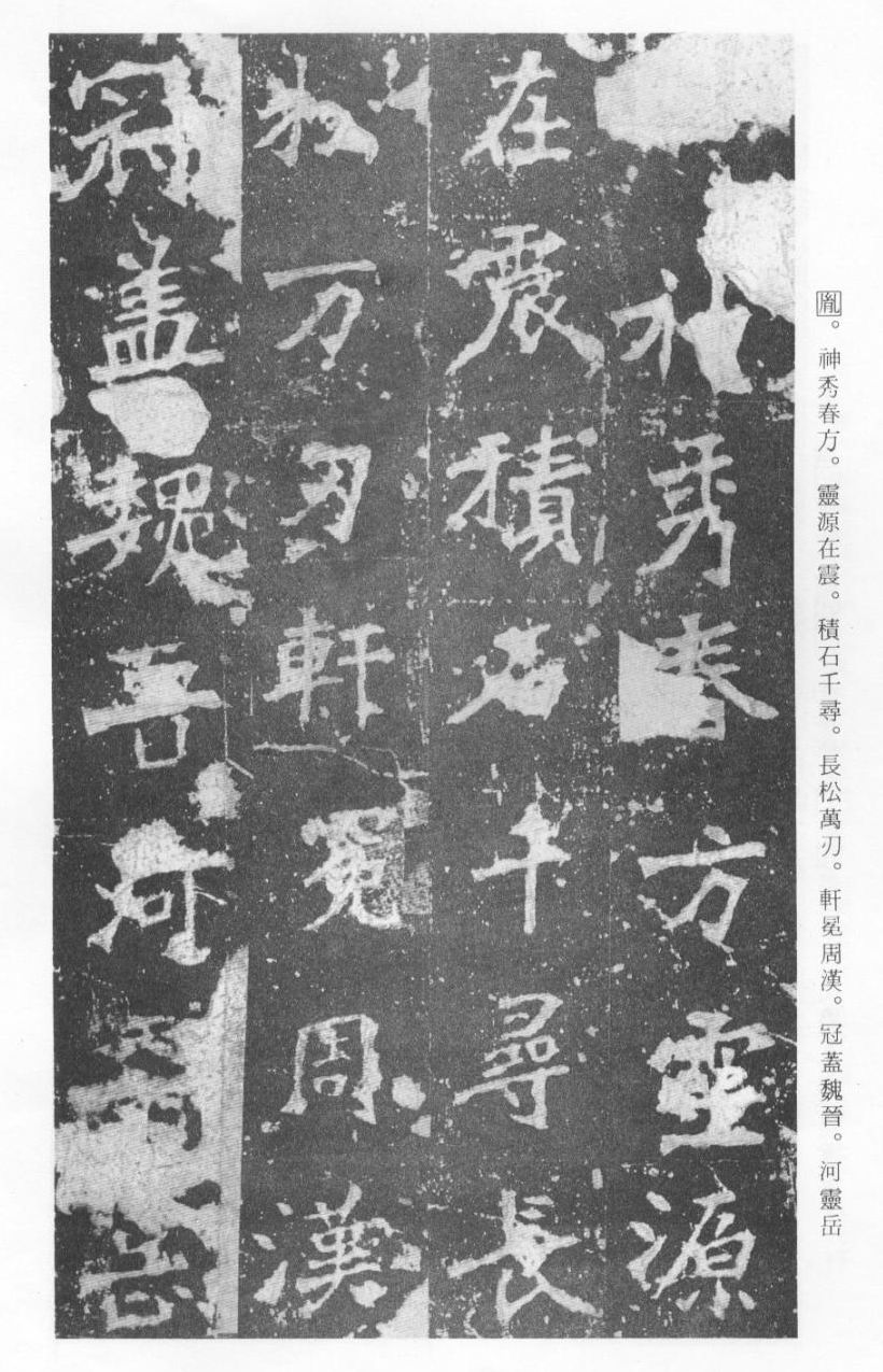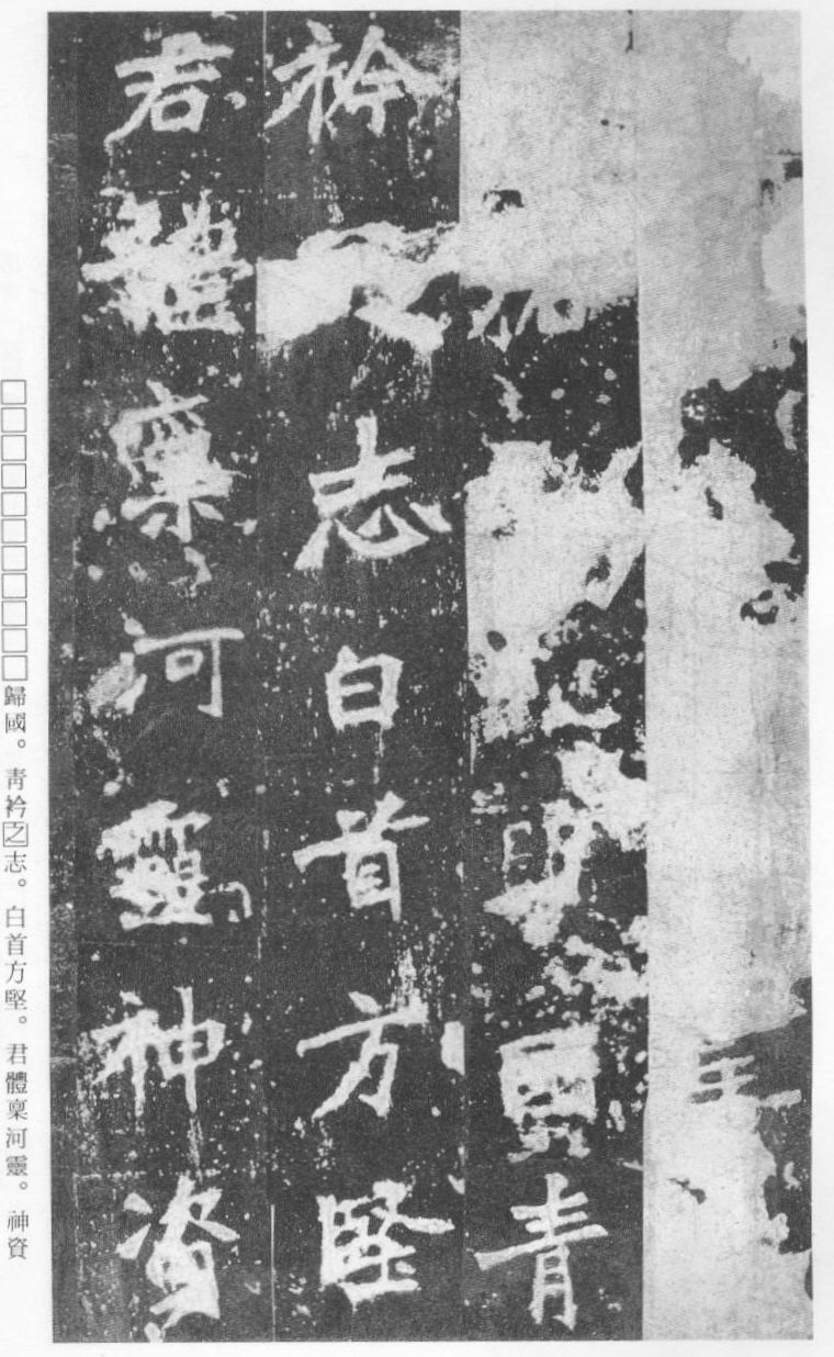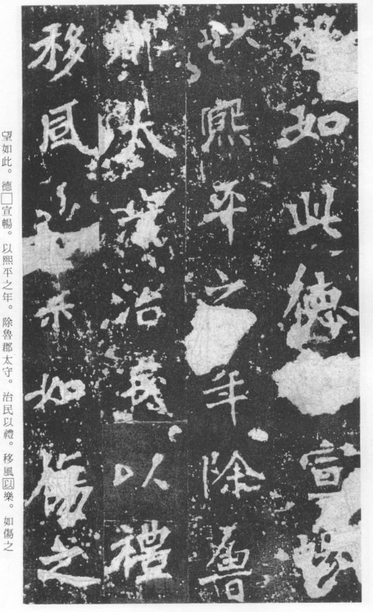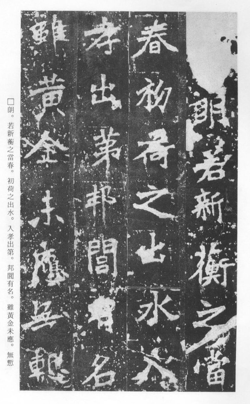 《张猛龙清颂碑》立于北魏孝明帝正光三年(五二二),全称《魏鲁郡太守张府君清颂之碑》,现在山东曲阜孔庙中,有额有阴,碑文记颂魏鲁郡太守张猛龙兴办学校功绩,碑阴为题名,古人评价其书“正法虬已开欧虞之门户”,向被世人誉为“魏碑第一”。楷书二十六行,行四十六字,是魏碑后期佳作之一。碑文书法用笔方圆并用,结字长方,笔画虽属横平竖直,但不乏变化,自然合度,妍丽多姿。碑文中的“冬温夏清”四字被认为是鉴别有关张猛龙碑古拓、今拓、原拓、翻拓的重要依据。据说有些古人拓碑,每拓一次之后就要把原碑上的某字去掉一点或留下某种印记,使后人之拓永远不能与前人之拓相雷同相媲美,更不用说伪造作假了,可见古人用心之良苦。