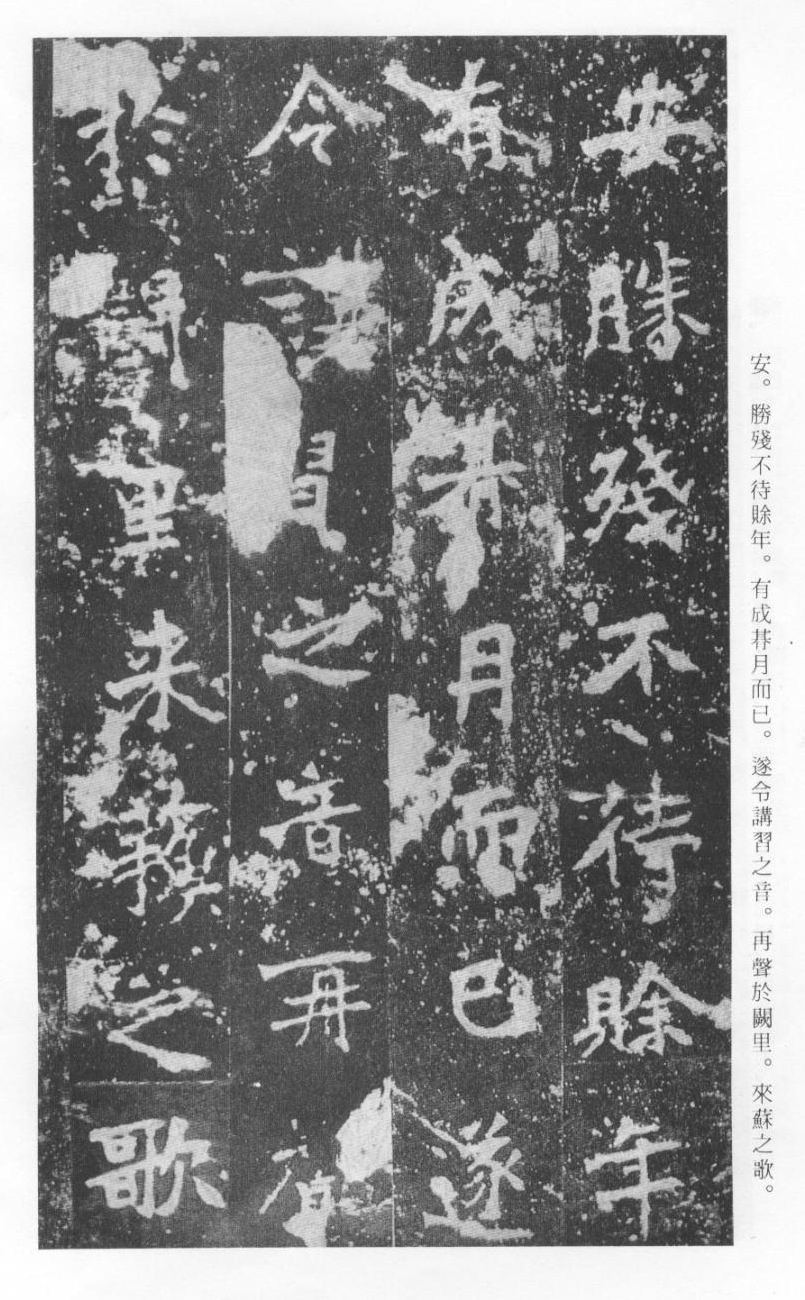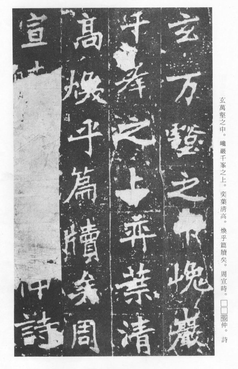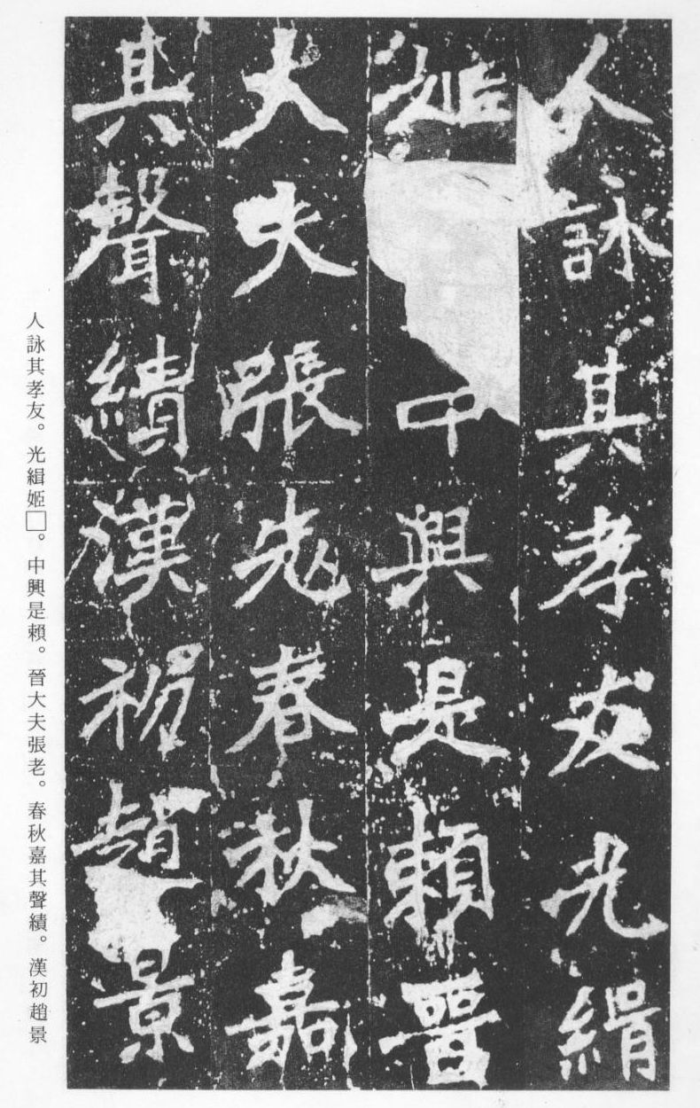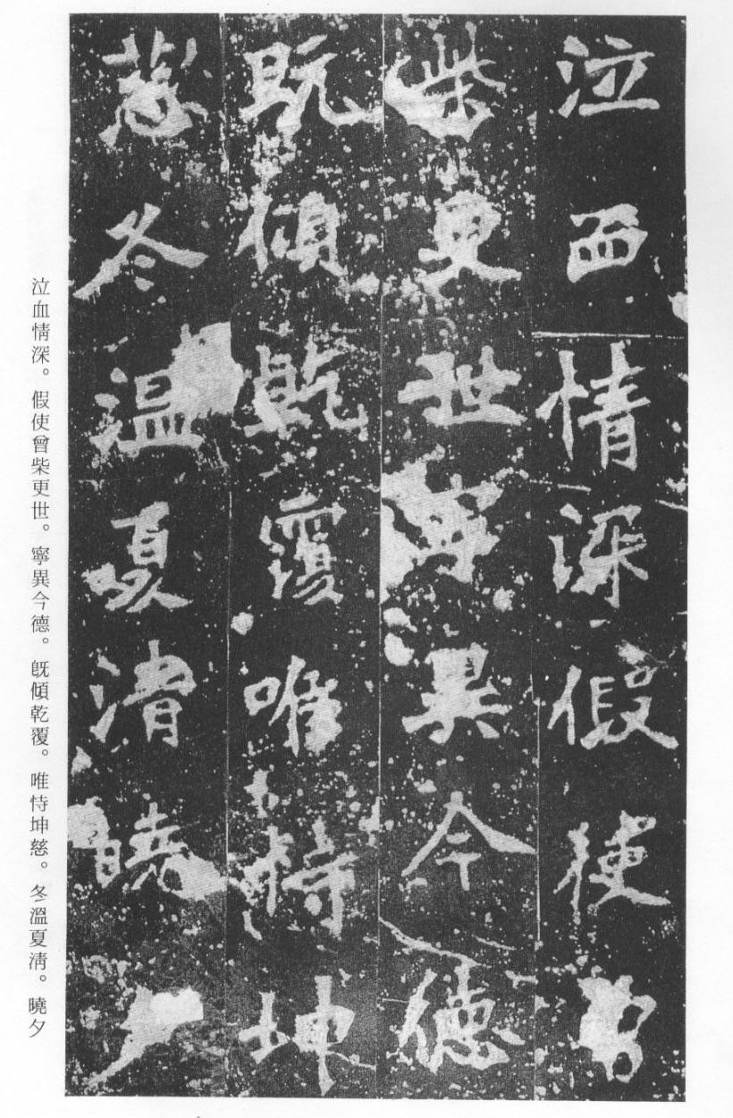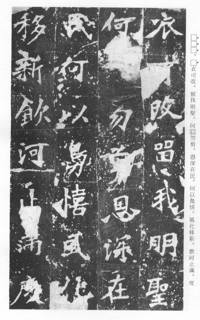 《张猛龙清颂碑》立于北魏孝明帝正光三年(五二二),全称《魏鲁郡太守张府君清颂之碑》,现在山东曲阜孔庙中,有额有阴,碑文记颂魏鲁郡太守张猛龙兴办学校功绩,碑阴为题名,古人评价其书“正法虬已开欧虞之门户”,向被世人誉为“魏碑第一”。楷书二十六行,行四十六字,是魏碑后期佳作之一。碑文书法用笔方圆并用,结字长方,笔画虽属横平竖直,但不乏变化,自然合度,妍丽多姿。碑文中的“冬温夏清”四字被认为是鉴别有关张猛龙碑古拓、今拓、原拓、翻拓的重要依据。据说有些古人拓碑,每拓一次之后就要把原碑上的某字去掉一点或留下某种印记,使后人之拓永远不能与前人之拓相雷同相媲美,更不用说伪造作假了,可见古人用心之良苦。