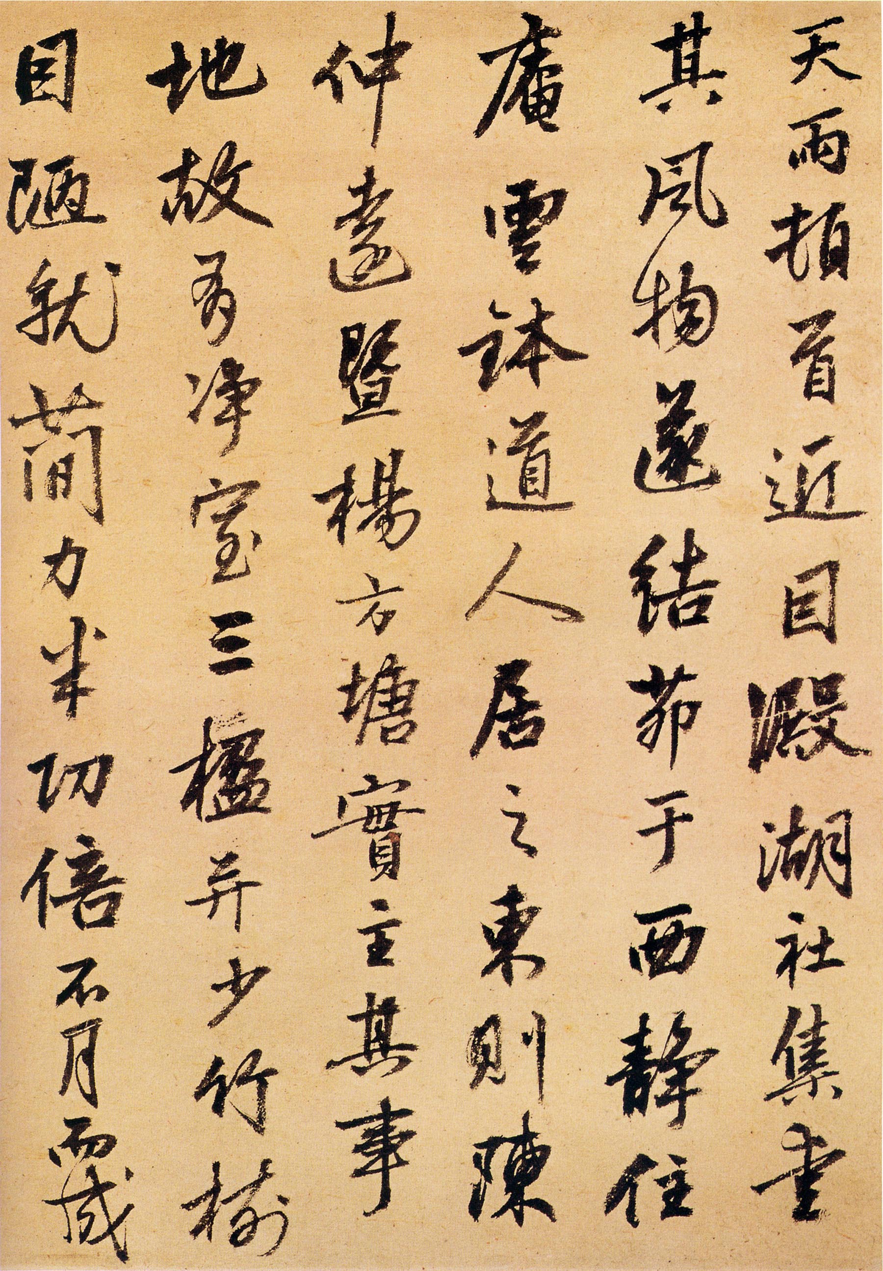 释文:天雨頓首。近因澱湖社集。愛其風物。遂結茆於西靜住庵雲鉢道人居之東。則陳仲遠暨楊方塘實主其事。地故有淨室三楹。并少竹樹。因陋就簡。力半功倍。不月而成。小閣野眺。九峯來賓。烟島汀沙。點點如畫。風(應作颿)水鷗。近狎几席。回想華陽舊居。已如閱世矣。然亦不久當西歸。無令空山鶴久怨人也。南來信便。消息時寄。天雨頓首□□賢兄侍史。八月廿四日。