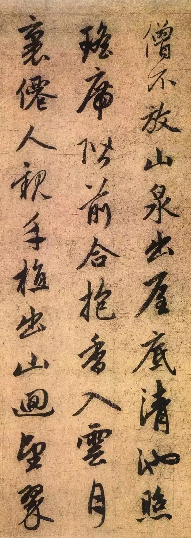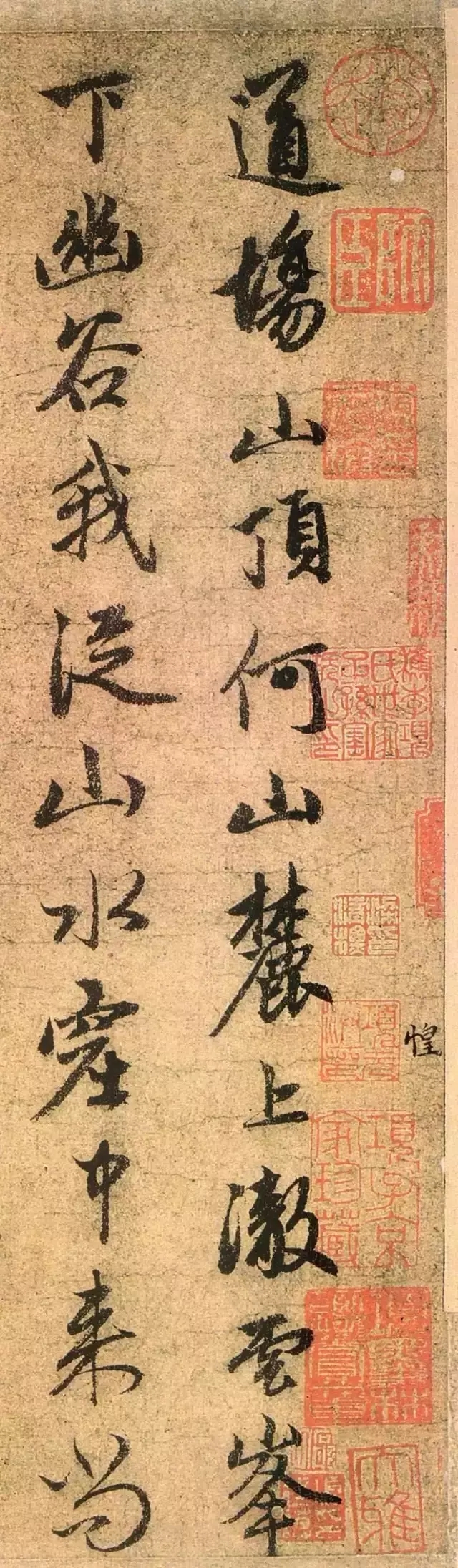 道场山、何山均为赵氏家乡湖州名山,峰峦秀郁,水石森爽,汇集了众多自然与人文景观,自古便为吴兴佳绝。历代文化名人在此留下了很多诗篇,苏轼作《游道场山何山》诗便是最著名者。此帖为赵孟頫为其长兄孟頔之孙所书。这件墨迹清劲秀丽,古雅有致,可谓诗书合璧。