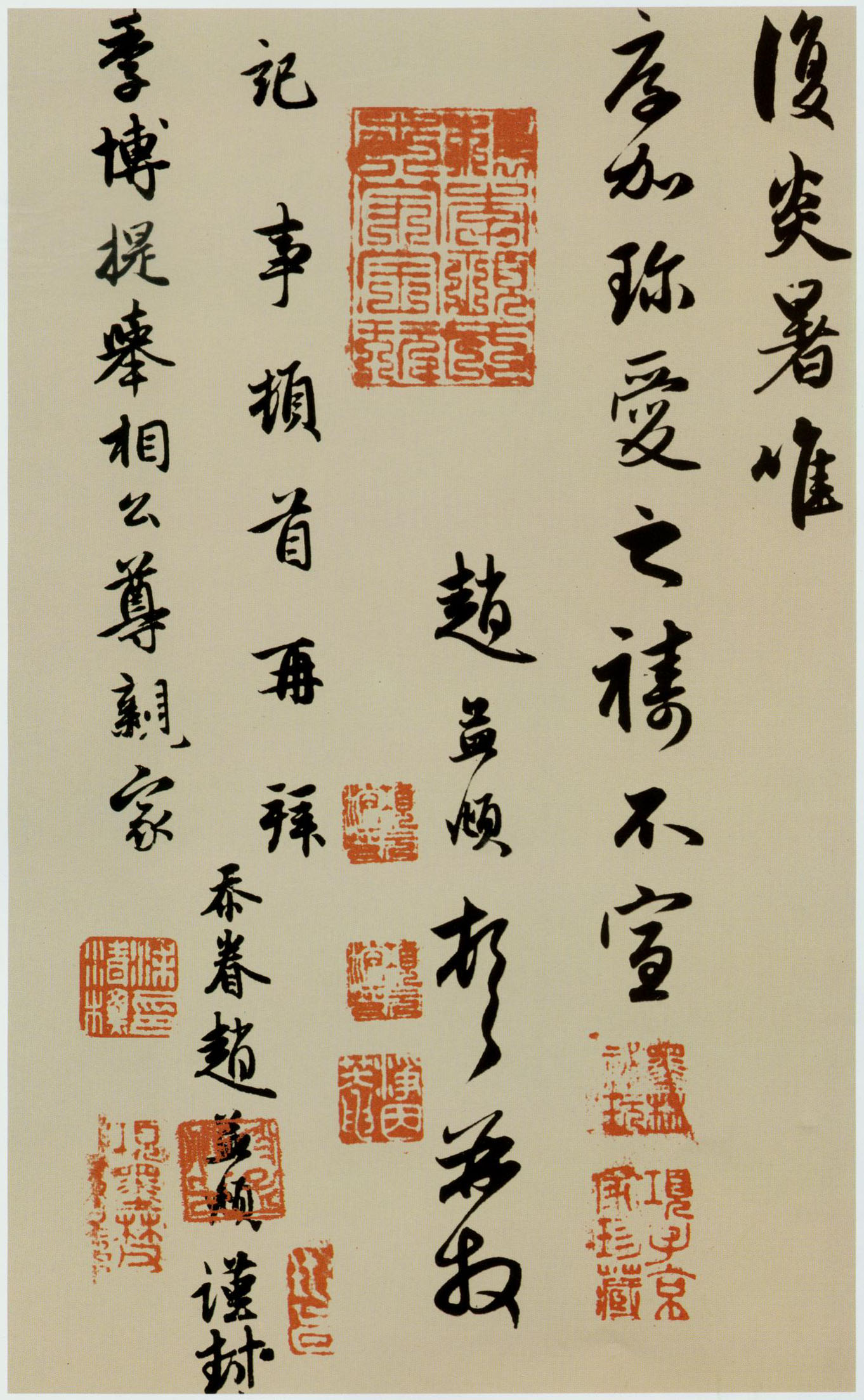 孟頫顿首再拜:季博提举相公尊亲家阁下。孟頫顷草率奉记。随蒙赐答。极慰倾驰之情。兹承惠书知。体中小不安。不审所苦者何。今进何乐。堂上尊夫人想 日来履候康和。欲得令弟踅还。今发一文字去。如此即可归也。人回。谨此具復。炎暑。唯厚加珍爱之祷。不宣。赵孟頫顿首再拜。记事顿首再拜。季博提举相公 尊亲家。忝眷赵孟頫谨封。