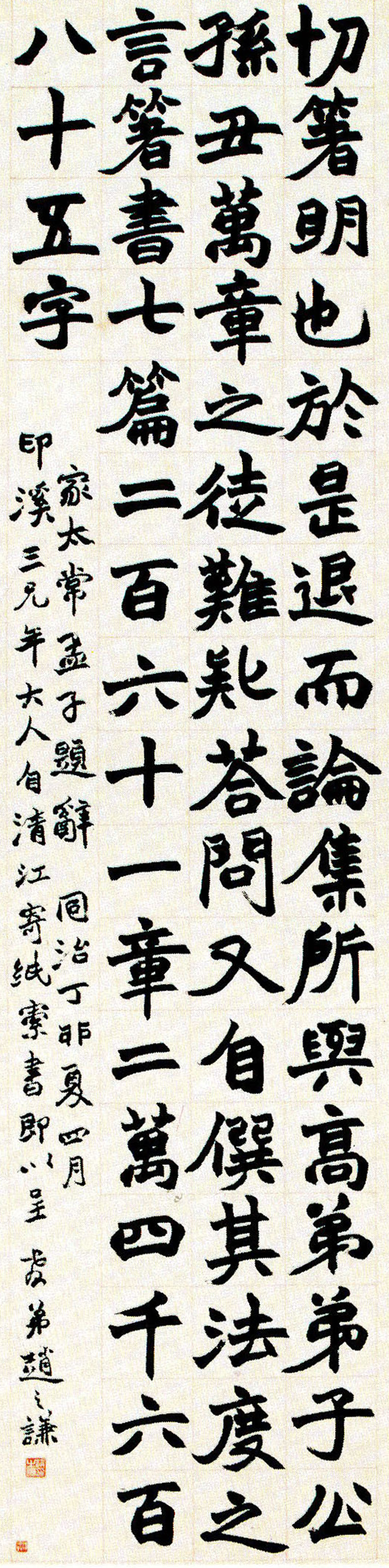 款识:家太常孟子题辞。同治丁卯夏四月,印溪三兄年大人自清江寄纸索书,即以呈教,弟赵之谦。